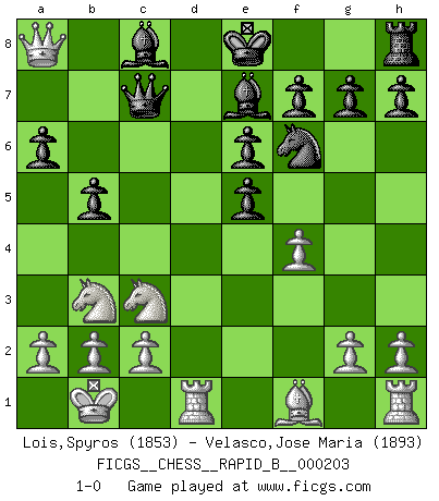 Last move : 1-0 2013 February 19 20:14:44 [Event "FICGS__CHESS__RAPID_B__000203"] [Site "FICGS"] [Date "2013.01.16"] [Round "1"] [White "Lois,Spyros"] [Black "Velasco,Jose Maria"] [Result "1-0"] [WhiteElo "1853"] [BlackElo "1893"] 1.e4 c5 2.Nf3 d6 3.d4 cxd4 4.Nxd4 Nf6 5.Nc3 a6 6.Bg5 e6 7.f4 Qb6 8.Nb3 Be7 9.Qf3 Nbd7 10.O-O-O Qc7 11.Kb1 b5 12.Bxf6 Nxf6 13.e5 dxe5 14.Qxa8 1-0 Sicilian : Najdorf, 7...Qb6 Queenside Castling by player White (move 10) Player White won this chess game. Follow this game move after move (download)All my games are real. (Bobby Fischer) Heutzutage gewinnt im Turnier nicht derjenige Spieler, der weitreichende Pläne entwirft, sondern einfach jener, der Zug um Zug kämpft. (David Bronstein) Yo no le temo a Spassky. Todos saben que yo soy el mejor. Uno no necesita un torneo para probarlo. (Bobby Fischer) Les échecs, c'est l'imagination. (David Bronstein) Memory is a crazy woman that hoards colored rags and throws away food. (Austin O'Malley)