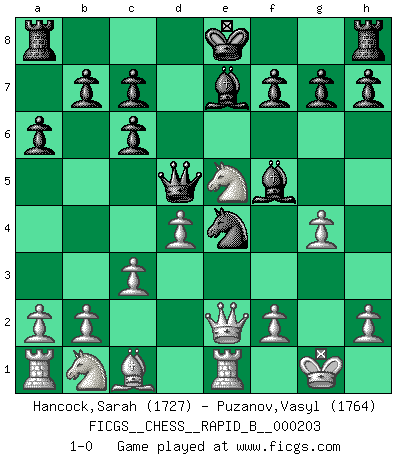 Last move : 1-0 2013 March 2 21:17:0 [Event "FICGS__CHESS__RAPID_B__000203"] [Site "FICGS"] [Date "2013.01.16"] [Round "1"] [White "Hancock,Sarah"] [Black "Puzanov,Vasyl"] [Result "1-0"] [WhiteElo "1727"] [BlackElo "1764"] 1.e4 e5 2.Nf3 Nc6 3.Bb5 Bc5 4.c3 a6 5.Bxc6 dxc6 6.Nxe5 Nf6 7.O-O Nxe4 8.Qe2 Qd5 9.d4 Be7 10.Re1 Bf5 11.g4 1-0 Ruy Lopez : Classical defense, 4.c3 Kingside Castling by player White (move 7) Player White won this chess game. Follow this game move after move (download)Bobby Fischer is the greatest Chess player who has ever lived. (Ken Smith) Bis jetzt ist Weiß einer wohlbekannten Analyse gefolgt. Aber jetzt begeht er einen schrecklichen Fehler: Er beginnt seinen eigenen Kopf zu benutzen. (Siegbert Tarrasch) Los errores estan ahí, esperando a que se cometan. (Savielly Tartakower) Votre prénom est 'Tactique', votre deuxième prénom est 'Tactique' et votre nom est 'Tactique'. (Ken Smith) That's absurd. I love it. (Gregory House, House M.D.)