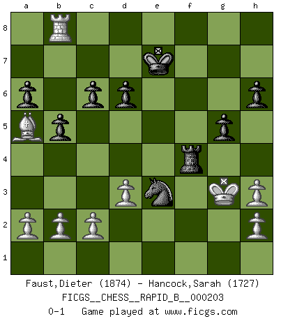 Last move : 0-1 2013 February 18 10:36:58 [Event "FICGS__CHESS__RAPID_B__000203"] [Site "FICGS"] [Date "2013.01.16"] [Round "1"] [White "Faust,Dieter"] [Black "Hancock,Sarah"] [Result "0-1"] [WhiteElo "1874"] [BlackElo "1727"] 1.e4 e5 2.Nf3 Nc6 3.Bb5 a6 4.Bxc6 dxc6 5.O-O Be6 6.Nxe5 Qd4 7.Nf3 Qxe4 8.Nc3 Qg6 9.Re1 O-O-O 10.d3 Bg4 11.Bf4 Ne7 12.Qe2 f6 13.Nh4 Qh5 14.f3 Bh3 15.gxh3 Qxh4 16.Qe6+ Kb8 17.Qg4 Ng6 18.Qxh4 Nxh4 19.Kf2 Bc5+ 20.Be3 Bd6 21.f4 g5 22.fxg5 fxg5 23.Ne4 h6 24.Nxd6 cxd6 25.Rf1 Rde8 26.Bb6 Rhf8+ 27.Kg3 Kc8 28.Rae1 Kd7 29.Rxe8 Rxf1 30.Rd8+ Ke7 31.Rb8 Rf4 32.Ba5 Nf5+ 33.Kg2 Ne3+ 34.Kg3 b5 0-1 Ruy Lopez : Exchange variation, 5.O-O Kingside Castling by player White (move 5) Queenside Castling by player Black (move 9) Player Black won this chess game. Follow this game move after move (download)When I asked Fischer why he had not played a certain move in our game, he replied: 'Well, you laughed when I wrote it down !' (Mikhail Tal) Im Leben werden Partien nie so unstrittig gewonnen wie im Spiel (Emanuel Lasker) Por la belleza de sus partidas, la claridad de su juego y lo brillante de sus ideas, Fischer se creó el mismo como un artista de la misma estatura como Brahms, Rembrandt y Shakespeare. (David Levy) L'action d'une oeuvre littéraire se déroule sur un champ de bataille. Les masques et les types du drame moderne correspondent aux pièces du jeu d'échecs. L'intrigue correspond aux coups et aux gambits, c'est à dire aux techniques du jeu telles qu'utilisées et interprétées par les joueurs. Les tactiques et les péripéties [mouvements] correspondent aux coups exécutés par l'adversaire. (Viktor Shklovsky) It's not the will to win, but the will to prepare to win that makes the difference. (Bear Bryant)