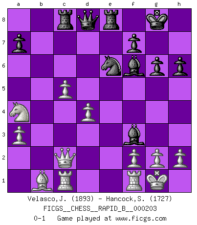 Last move : 0-1 2013 February 21 21:43:44 [Event "FICGS__CHESS__RAPID_B__000203"] [Site "FICGS"] [Date "2013.01.16"] [Round "1"] [White "Velasco,Jose Maria"] [Black "Hancock,Sarah"] [Result "0-1"] [WhiteElo "1893"] [BlackElo "1727"] 1.d4 d5 2.c4 e6 3.Nc3 Nf6 4.Bg5 Be7 5.Nf3 O-O 6.e3 h6 7.Bh4 b6 8.Be2 Bb7 9.Bxf6 Bxf6 10.cxd5 exd5 11.O-O c6 12.Rc1 Re8 13.Bd3 Na6 14.a3 Nc7 15.b4 Ne6 16.Bb1 c5 17.bxc5 bxc5 18.dxc5 Rc8 19.Qc2 g6 20.Na4 d4 21.exd4 Bxf3 0-1 QGD : 4.Bg5 Be7 Kingside Castling by player Black (move 5) Kingside Castling by player White (move 11) Player Black won this chess game. Follow this game move after move (download)I prefer to lose a really good game than to win a bad one. (David Levy) Schach ist Krieg, im Schach geht es um testosterongesteuerte Urschreie. (Garry Kasparov) Del Ajedrez se ha dicho que la vida no es lo suficientemente larga para él, pero eso es culpa de la vida, no del Ajedrez. (William Ewart Napier) Les ravages du H expliquent la différence de niveau entre Tal et Thal [Abergel]. Wisdom doesn't necessarily come with age. Sometimes age just shows up all by itself. (Tom Wilson)