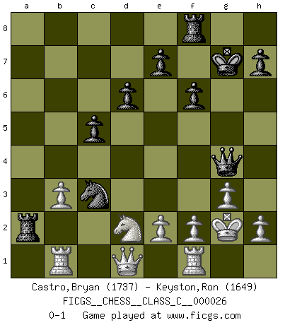 Last move : 0-1 2007 April 26 23:0:50 [Event "FICGS__CHESS__CLASS_C__000026"] [Site "FICGS"] [Date "2007.01.24"] [Round "1"] [White "Castro,Bryan"] [Black "Keyston,Ron"] [Result "0-1"] [WhiteElo "1737"] [BlackElo "1649"] 1.d4 Nf6 2.c4 c5 3.d5 b5 4.cxb5 a6 5.bxa6 g6 6.Nc3 Bxa6 7.g3 d6 8.Bg2 Bg7 9.Nf3 Nbd7 10.Rb1 Nb6 11.b3 Bb7 12.Nh4 O-O 13.O-O Qd7 14.Bb2 g5 15.Nf3 Nfxd5 16.Nxd5 Bxd5 17.Bxg7 Kxg7 18.Nxg5 Bxg2 19.Kxg2 f6 20.Nf3 Rxa2 21.Nd2 Nd5 22.Qc1 Qg4 23.Qd1 Nc3 0-1 Benko gambit accepted Kingside Castling by player Black (move 12) Kingside Castling by player White (move 13) Player Black won this chess game. Follow this game move after move (download)You must take your opponent into a deep dark forest where 2+2=5, and the path leading out is only wide enough for one. (Mikhail Tal) Im Blitz ist es einfacher mit einer Figur weniger anzugreifen, als sich mit einer Mehrfigur zu verteidigen. (Mikhail Nekhemyevich Tal) Si pudieramos observar el interior de la cabeza de un jugador de Ajedrez, encontraríamos ahí un mundo lleno de sentimientos, imágenes, ideas, emoción y pasión. (Alfred Binet) Il n'y a pas de prix trop élevé au scalp de l'ennemi. (Koblentz) The problem with manipulation is that people can turn on you. (Horatio Caine, C.S.I. Miami)
