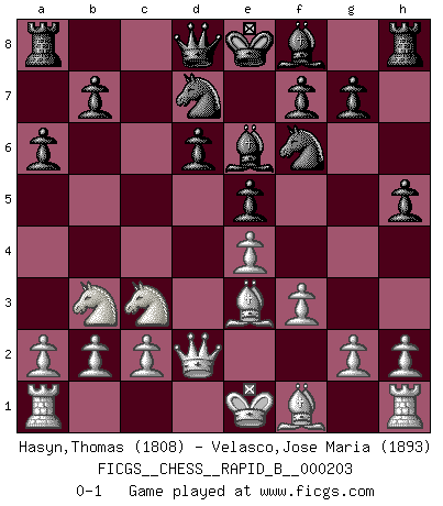 Last move : 0-1 2013 March 10 5:28:20 [Event "FICGS__CHESS__RAPID_B__000203"] [Site "FICGS"] [Date "2013.01.16"] [Round "1"] [White "Hasyn,Thomas"] [Black "Velasco,Jose Maria"] [Result "0-1"] [WhiteElo "1808"] [BlackElo "1893"] 1.e4 c5 2.Nf3 d6 3.d4 cxd4 4.Nxd4 Nf6 5.Nc3 a6 6.Be3 e5 7.Nb3 Be6 8.Qd2 Nbd7 9.f3 h5 0-1 This chess game has been lost on time (started : 2013.01.16 10:35:19) Sicilian : Najdorf, Byrne (English) attack Player Black won this chess game. Follow this game move after move (download)If cunning alone were needed to excel, women would be the best Chess players. (Albin) Ich weiss nicht was Gott gegen mich auf 1.e4 antworten würde. (Robert James Fischer) Puntos débiles o agujeros en la posición de tu oponente deben de ser ocupados por piezas, no Peones. (Siegbert Tarrasch) La vie et les Echecs sont tous les deux une lutte constante. (Lasker) The Internet is the world's largest library. It's just that all the books are on the floor. (John Allen Paulos)