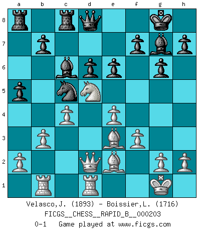 Last move : 0-1 2013 February 26 0:18:5 [Event "FICGS__CHESS__RAPID_B__000203"] [Site "FICGS"] [Date "2013.01.16"] [Round "1"] [White "Velasco,Jose Maria"] [Black "Boissier,Lucien"] [Result "0-1"] [WhiteElo "1893"] [BlackElo "1716"] 1.e4 c5 2.Nf3 Nc6 3.d4 cxd4 4.Nxd4 g6 5.c4 Bg7 6.Be3 Nf6 7.Nc3 O-O 8.Be2 d6 9.O-O Bd7 10.Qd2 Nxd4 11.Bxd4 Bc6 12.f3 a5 13.b3 Nd7 14.Be3 Nc5 15.Rab1 Qb6 16.Rfc1 Rfc8 17.Nd5 Qd8 18.Rd1 e6 0-1 Sicilian : Accelerated Fianchetto, Maroczy bind, 6.Be3 Kingside Castling by player Black (move 7) Kingside Castling by player White (move 9) Player Black won this chess game. Follow this game move after move (download)Only the player with the initiative has the right to attack. (Wilhelm Steinitz) Der Bart als Geschlechtszeichen mitten im Gesicht ist obszön. Daher gefällt er den Weibern. [Zugegeben, kein Schachzitat, aber unglaublich originell] (Arthur Schopenhauer) Con el tiempo, empecé a progresar en partidas decisivas. Tal vez porque me di cuenta de una simple verdad: no solo estaba yo nervioso sino también mi oponente. (Mikhail Tal) Lorsque vous vous retrouvez devant une position atroce, ne tendez pas un ultime piège dérisoire avec l'intention d'abandonner si l'adversaire le déjoue ! Faites-vous plutôt un devoir de résister comme si votre vie en dépendait. Jouez le coup qui vous déplairait au centuple si vous étiez dans la peau de votre tortionnaire ! Have no fear of perfection - you'll never reach it. (Salvador Dali)