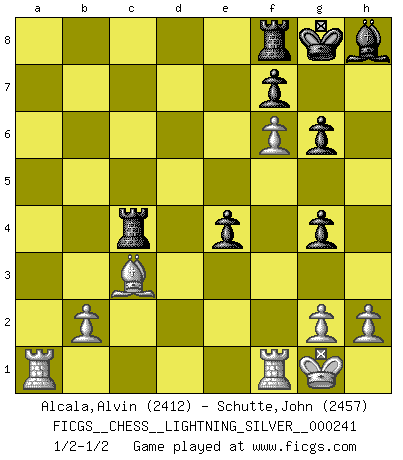 Last move : 1/2-1/2 2013 January 16 17:54:14 [Event "FICGS__CHESS__LIGHTNING_SILVER__000241"] [Site "FICGS"] [Date "2013.01.16"] [Round "1"] [White "Alcala,Alvin"] [Black "Schutte,John"] [Result "1/2-1/2"] [WhiteElo "2412"] [BlackElo "2457"] 1.e4 c5 2.Nf3 d6 3.d4 cxd4 4.Nxd4 Nf6 5.Nc3 a6 6.Be3 e5 7.Nb3 Be6 8.f3 h5 9.Be2 Nbd7 10.Nd5 Bxd5 11.exd5 g6 12.Qd2 Bg7 13.Na5 Rb8 14.O-O e4 15.f4 Ng4 16.Bxg4 hxg4 17.Nc4 O-O 18.f5 Qc7 19.Qb4 b5 20.Na5 Rbe8 21.Nc6 Ne5 22.f6 Nxc6 23.dxc6 Bh8 24.a4 bxa4 25.Qxa4 Re6 26.Bd4 d5 27.Qxa6 Rxc6 28.Qb5 Rxc2 29.Qxd5 Qc4 30.Qxc4 Rxc4 31.Bc3 1/2-1/2 Sicilian : Najdorf, Byrne (English) attack Kingside Castling by player White (move 14) Kingside Castling by player Black (move 17) This chess game ended in a draw. Follow this game move after move (download)Chess is the gymnasium of the mind. (Blaise Pascal) Dass jemand wie Surab Asmaiparaschwili, der selbst Elopunkte gekauft hat , Vize-Präsident der Fide werden konnte, sagt schon einges über den Zustand dieser Organisation aus. (Joel Lautier) Todos los Maestros de Ajedrez fueron un día unos principiantes. (Chernev) L'ordinateur a tué l'originalité. Il n'y a plus guère d'aventures sur l'échiquier. (Jacob Murray) The quality of decision is like the well-timed swoop of a falcon which enables it to strike and destroy its victim. (Sun Tzu)