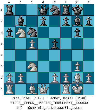 Last move : 1-0 2013 February 7 21:43:37 [Event "FICGS__CHESS__UNRATED_TOURNAMENT__000030"] [Site "FICGS"] [Date "2013.01.17"] [Round "1"] [White "Riha,Josef"] [Black "Jabot,Daniel"] [Result "1-0"] [WhiteElo "1961"] [BlackElo "1948"] 1.c4 c5 2.Nc3 Nc6 3.Nf3 Nf6 4.g3 g6 5.Bg2 Bg7 6.O-O O-O 7.d4 cxd4 8.Nxd4 e5 9.Ndb5 Ne8 10.c5 a6 11.Nd6 b6 12.Nc4 Bb7 13.Nxb6 1-0 English : Symmetrical, Four knights system Kingside Castling by player White (move 6) Kingside Castling by player Black (move 6) Player White won this chess game. Follow this game move after move (download)Examine moves that smite! A good eye for smites is far more important than a knowledge of strategical principles. (Purdy) Es tut gut, die Entwicklungsperiode von, [...] demokratischem Geist durchdringen zu lassen. Wie undemokratisch wäre es doch beispielsweise, den einen Offizier große Spaziertouren vornehmen zu lassen, während die anderen zu Hause säßen und sich entsetzlich langweilten. (Aaron Nimzowitsch) El Ajedrez te enseña a controlarl la excitación inicial que sientes cuando vez algo que parece bueno y te enseña a pensar objetivamente cuando te encuentras en problemas. (Stanley Kubrick) Les échecs, c'est l'imagination. (David Bronstein) If we knew what we were doing, we would not call it research. (Albert Einstein)
