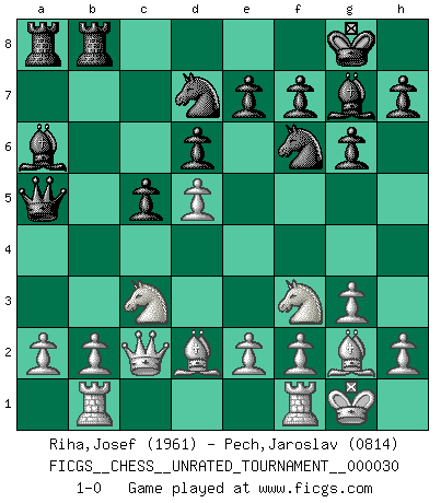 Last move : 1-0 2013 May 18 22:54:21 [Event "FICGS__CHESS__UNRATED_TOURNAMENT__000030"] [Site "FICGS"] [Date "2013.01.17"] [Round "1"] [White "Riha,Josef"] [Black "Pech,Jaroslav"] [Result "1-0"] [WhiteElo "1961"] [BlackElo "0814"] 1.d4 Nf6 2.c4 c5 3.d5 b5 4.cxb5 a6 5.bxa6 Bxa6 6.Nc3 g6 7.Nf3 d6 8.g3 Bg7 9.Bg2 Nbd7 10.Rb1 O-O 11.O-O Qa5 12.Bd2 Rfb8 13.Qc2 1-0 This chess game has been lost on time (started : 2013.01.17 1:22:27) Benko gambit accepted Kingside Castling by player Black (move 10) Kingside Castling by player White (move 11) Player White won this chess game. Follow this game move after move (download)It is difficult to play against Einstein's theory --on his first loss to Fischer. (Mikhail Tal) Garry Kasparov war erst in der Großmeister-Organisation GMA, dann in der Profischach-Vereinigung PCA, zum Schluss kehrte er wieder in den Schoß der FIDE zurück. Aber gut, manche Leute sind flexibel (Viswanathan Anand) Las ideas audaces son como las piezas del Ajedrez que avanzan hacia adelante. Ellas pueden ser vencidas, pero también pueden iniciar una partida victoriosa. (Goethe) Les Echecs ne sont pas pour les âmes timides. Ils requièrent un homme entier, qui ne s'arrête pas aveuglément à ce qui a été déjà établi, mais qui tente individuellement de sonder les profondeurs du jeu. (W. Steinitz) If you ain't just a little scared when you enter a casino, you are either very rich or you haven't studied the games enough. (Pappy)