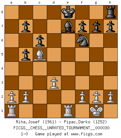 Last move : 1-0 2013 January 23 7:2:11 [Event "FICGS__CHESS__UNRATED_TOURNAMENT__000030"] [Site "FICGS"] [Date "2013.01.17"] [Round "1"] [White "Riha,Josef"] [Black "Pipac,Darko"] [Result "1-0"] [WhiteElo "1961"] [BlackElo "1252"] 1.e4 e5 2.Nf3 Nc6 3.Bb5 d6 4.d4 Bd7 5.Nc3 a6 6.Bxc6 Bxc6 7.dxe5 dxe5 8.Qxd8+ Rxd8 9.Nxe5 Bb5 10.Nxb5 axb5 11.O-O Nf6 12.Nd3 c6 13.Be3 Nxe4 14.Rfe1 Be7 15.Bb6 Rxd3 16.cxd3 Nf6 17.Bc5 1-0 Ruy Lopez : Old Steinitz defense Kingside Castling by player White (move 11) Player White won this chess game. Follow this game move after move (download)Only sissies Castle. (Rob Sillars) Über Kasparov: Es ist offensichtlich, daß er in einem totalitären Staat aufwuchs und deshalb zu diktatorischen Zügen neigt. (Viktor Kortschnoi) La pasion por jugar al Ajedrez es una de las mas inexplicables en el mundo. (H.G. Wells) Il n'y a plus de joueurs du niveau de Jacob Murray dont la seule quête est le beau jeu, le plaisir de voir les pièces construire quelque chose. Sur 10 idées à la minute, 9 seront sans intérêt, la dernière s'avèrera géniale. (Christian Bauer) History is a gallery of pictures in which there are few originals and many copies. (Alexis de Tocqueville)