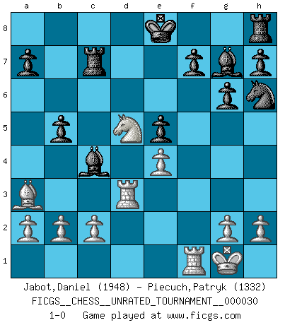 Last move : 1-0 2013 May 24 23:20:56 [Event "FICGS__CHESS__UNRATED_TOURNAMENT__000030"] [Site "FICGS"] [Date "2013.01.17"] [Round "1"] [White "Jabot,Daniel"] [Black "Piecuch,Patryk"] [Result "1-0"] [WhiteElo "1948"] [BlackElo "1332"] 1.e4 c5 2.Nf3 d6 3.d4 cxd4 4.Nxd4 Nf6 5.Nc3 Nc6 6.Bb5 Bd7 7.O-O g6 8.Be3 Bg7 9.f4 Ng4 10.Nxc6 bxc6 11.Bd4 e5 12.fxe5 dxe5 13.Bc5 cxb5 14.Qd5 Nh6 15.Rad1 Rc8 16.Rd3 Be6 17.Qb7 Qc7 18.Qxc7 Rxc7 19.Ba3 Bc4 20.Nd5 1-0 This chess game has been lost on time (started : 2013.01.17 1:22:27) Sicilian Kingside Castling by player White (move 7) Player White won this chess game. Follow this game move after move (download)Who is your opponent tonight, tonight I am playing against the Black pieces. (Akiba Rubinstein) Im Internet Chess Club betrug mein Rating vorübergehend 3350 ELO-Punkte. (Sergej Karjakin) El Peón aislado arroja penumbra sobre todo el tablero. (Aaron Nimzovich) La vie est comme un jeu d'échecs : nous esquissons un plan, mais celui-ci est tributaire de ce que daignent faire l'adversaire aux échecs et le destin dans la vie. (Arthur Schopenhauer) I don't know, I don't care, and it doesn't make any difference. (Albert Einstein)