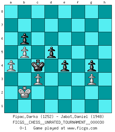 Last move : 0-1 2013 March 27 18:21:5 [Event "FICGS__CHESS__UNRATED_TOURNAMENT__000030"] [Site "FICGS"] [Date "2013.01.17"] [Round "1"] [White "Pipac,Darko"] [Black "Jabot,Daniel"] [Result "0-1"] [WhiteElo "1252"] [BlackElo "1948"] 1.e4 c5 2.Nc3 d6 3.Nf3 Nf6 4.h3 Nc6 5.Bb5 e6 6.d4 cxd4 7.Qxd4 Bd7 8.Bxc6 Bxc6 9.Bg5 Be7 10.O-O-O O-O 11.Rhe1 e5 12.Qd3 Ne8 13.Bxe7 Qxe7 14.Nd5 Bxd5 15.Qxd5 Rd8 16.Rd3 Nf6 17.Qc4 Rc8 18.Qb4 Rc5 19.Rc3 Rfc8 20.R1e3 a5 21.Qa3 Rxc3 22.Rxc3 Rxc3 23.Qxc3 Nxe4 24.Qxa5 h6 25.Qe1 f5 26.Nd2 Qg5 27.g3 Kf7 28.c3 Ke6 29.Kc2 Nxd2 30.Qxd2 Qxd2+ 31.Kxd2 g5 32.b4 Kd5 33.f3 h5 34.a4 Kc4 35.Kc2 g4 36.hxg4 hxg4 37.fxg4 fxg4 38.Kd2 d5 39.b5 Kc5 40.Kd3 b6 41.Kc2 Kc4 42.Kb2 e4 0-1 Sicilian : Closed Queenside Castling by player White (move 10) Kingside Castling by player Black (move 10) 10 pieces endgame at move 37 : White KPPPP , Black KPPPP WHITE : King + 4 Pawns BLACK : King + 4 Pawns Player Black won this chess game. Follow this game move after move (download)The passion for playing Chess is one of the most unaccountable in the world. (H.G. Wells) Vielleicht wirkt die Aura früherer Spieler glanzvoller als die der heutigen Spieler, aber das liegt daran, dass man kein Programm wie Fritz hatte, das einem all die Löcher in ihren Partien zeigt. (Vladimir Kramnik) Debió haber existido una vez en que los hombres eran semidióses, de otra manera no hubiesen podido inventar el Ajedrez. (Gustav Schenk) La conception d'un plan est le processus par lequel un joueur exploite les avantages de sa position tout en s'efforçant d'en réduire au minimum les inconvénients. Afin de garantir le succès, un plan doit toujours se fonder sur un diagnostic objectif des particularités d'une position. La conception d'un plan est d'autant plus difficile que la position est équilibrée, et grandement facilitée lorsqu'il n'existe qu'un seul plan susceptible de répondre aux exigences de la position. (Harry Golombek) They misunderestimated me. (George W. Bush, Bentonville nov. 6, 2000)