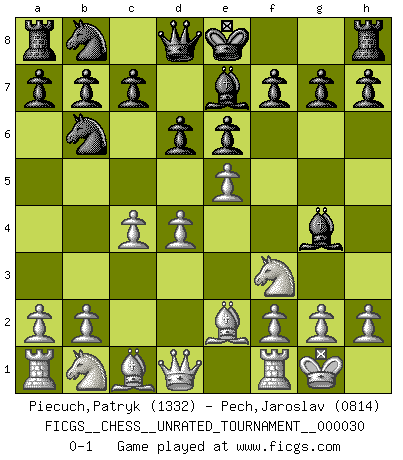 Last move : 0-1 2013 May 2 21:46:12 [Event "FICGS__CHESS__UNRATED_TOURNAMENT__000030"] [Site "FICGS"] [Date "2013.01.17"] [Round "1"] [White "Piecuch,Patryk"] [Black "Pech,Jaroslav"] [Result "0-1"] [WhiteElo "1332"] [BlackElo "0814"] 1.e4 Nf6 2.e5 Nd5 3.d4 d6 4.Nf3 Bg4 5.Be2 e6 6.c4 Nb6 7.O-O Be7 0-1 This chess game has been lost on time (started : 2013.01.17 1:22:27) Alekhine's defense : Modern variation, 4...Bg4 Kingside Castling by player White (move 7) Player Black won this chess game. Follow this game move after move (download)I'm not a materialistic person, in that, I don't suffer the lack or loss of money. The absence of worldly goods I don't look back on. For Chess is a way I can be as materialistic as I want without having to sell my soul. (Jamie Walter Adams) Ein guter Spieler hat immer Glück. (José Raúl Capablanca) Con el tiempo, empecé a progresar en partidas decisivas. Tal vez porque me di cuenta de una simple verdad: no solo estaba yo nervioso sino también mi oponente. (Mikhail Tal) Les écrivains ont utilisé les échecs pour analyser les côtés extrêmes de la nature humaine. Dans ce cadre, les échecs offrent un champ d'expérimentation idéal. Mais on pourrait faire la même chose avec la peinture. Et là, en vous référant à Van Gogh, vous ne tirerez pas de conclusion définitive sur les peintres. (Gary Kasparov) Chess is everything: art, science and sport. (Anatoly Karpov)