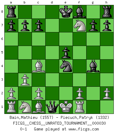 Last move : 0-1 2013 June 4 19:35:27 [Event "FICGS__CHESS__UNRATED_TOURNAMENT__000030"] [Site "FICGS"] [Date "2013.01.17"] [Round "1"] [White "Bain,Mathieu"] [Black "Piecuch,Patryk"] [Result "0-1"] [WhiteElo "1557"] [BlackElo "1332"] 1.e4 e5 2.Nf3 Nf6 3.d4 Nc6 4.Bc4 d6 5.Ng5 d5 6.exd5 Nxd4 7.d6 Qxd6 8.Nxf7 Qc6 9.b3 Qxg2 10.Rf1 Bg4 11.Qd3 Nf3+ 12.Qxf3 Qxf3 13.Kd2 Ne4+ 14.Ke1 Qd1+ 0-1 Petrov : Modern (Steinitz) attack Player Black won this chess game. Follow this game move after move (download)Bobby Fischer's current state of mind is indeed a tragedy. One of the world's greatest Chess players - the pride and sorrow of American Chess. (Frank Brady) Fischer machte Schach einfach zu einer aufregenden Sache, wann immer er sich ans Brett setzte. (Raymond Keene) Entre mas años cumplo, mas valoro los Peones. (Keres) RxDa4 pat (...) There are two types of people in this world, good and bad. The good sleep better, but the bad seem to enjoy the waking hours much more. (Woody Allen)