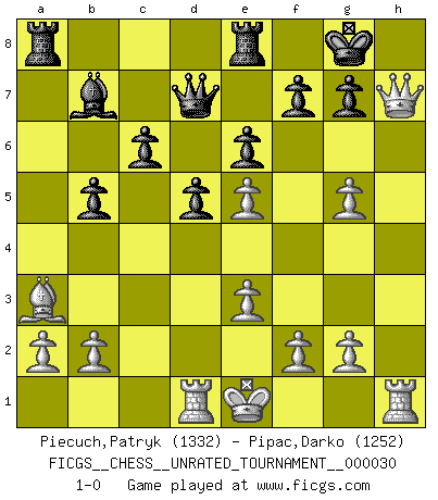 Last move : 1-0 2013 April 10 2:47:8 [Event "FICGS__CHESS__UNRATED_TOURNAMENT__000030"] [Site "FICGS"] [Date "2013.01.17"] [Round "1"] [White "Piecuch,Patryk"] [Black "Pipac,Darko"] [Result "1-0"] [WhiteElo "1332"] [BlackElo "1252"] 1.d4 Nf6 2.c4 d5 3.Nc3 e6 4.Nf3 Bb4 5.e3 O-O 6.Bd2 Bxc3 7.Bxc3 Ne4 8.Bb4 Re8 9.Bd3 Nc6 10.Ba3 a6 11.Qc2 Ng5 12.Ne5 Nxe5 13.dxe5 b5 14.cxb5 Bb7 15.Rd1 Qd7 16.h4 axb5 17.hxg5 c6 18.Bxh7+ Kh8 19.Bg8 Kxg8 20.Qh7+ 1-0 Queen's pawn game Kingside Castling by player Black (move 5) Player White won this chess game. Follow this game move after move (download)One bad move nullifies forty good ones. (Horowitz) Ein Buch ist ein Spiegel; wenn ein Affe hineinsieht, so kann kein Apostel heraus gucken. (Georg Christoph Lichtenberg) Cuando tengo las piezas blancas, yo gano porque soy blanco; Cuando tengo las piezas negras, yo gano porque soy Bogolyubov. (Bogolyubov) La guerre est enfant de la passion, la passion est enfant du narcissisme et le narcissisme est l'enfant. (...) Une autre partie ? (Thibault de Vassal) A good player is always lucky. (Capablanca)