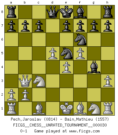 Last move : 0-1 2013 May 26 12:6:25 [Event "FICGS__CHESS__UNRATED_TOURNAMENT__000030"] [Site "FICGS"] [Date "2013.01.17"] [Round "1"] [White "Pech,Jaroslav"] [Black "Bain,Mathieu"] [Result "0-1"] [WhiteElo "0814"] [BlackElo "1557"] 1.d4 d5 2.c4 Nf6 3.cxd5 Nxd5 4.e4 Nf6 5.Nc3 Nc6 6.d5 Ne5 7.f4 Bg4 8.Qb3 Ng6 9.f5 Ne5 10.h3 Bh5 11.g4 Bxg4 0-1 QGD : Marshall defense Player Black won this chess game. Follow this game move after move (download)The blunders are all there on the board, waiting to be made. (Savielly Tartakover) Der Knackpunkt bei der Konzentration ist, daß wir nur durch sie etwas Neues und Ungewöhnliches am Schachbrett finden können. Sie ist der einzige Weg durch neue neue Ideen eine Überraschung zu bereiten. (Garry Kasparov) Dejen al perfeccionista jugar por correo. (Yasser Seirawan) Seul un grand joueur sait à quel point il joue faiblement. (Xavier Tartacover) There are more things in heaven and earth than practically anywhere else. (Unknown)