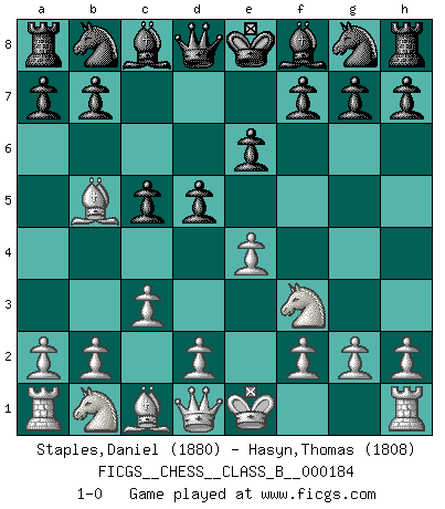 Last move : 1-0 2013 March 24 6:43:47 [Event "FICGS__CHESS__CLASS_B__000184"] [Site "FICGS"] [Date "2013.01.18"] [Round "1"] [White "Staples,Daniel"] [Black "Hasyn,Thomas"] [Result "1-0"] [WhiteElo "1880"] [BlackElo "1808"] 1.e4 e6 2.Nf3 c5 3.c3 d5 4.Bb5+ 1-0 This chess game has been lost on time (started : 2013.01.18 16:21:44) French defense Player White won this chess game. Follow this game move after move (download)Daring ideas are like Chess men moved forward. They may be beaten, but they may start a winning game. (Johann Wolfgang von Goethe) Jede Eröffnung ist gut genug um gespielt zu werden, wenn nur ihr Ruf schlecht genug ist. (Savielly Grigorievitsch Tartakower) Peones: ellos son el alma de esta partida, solos forman el ataque y la defensa. (Philidor) Ce n'est pas pour s'amuser qu'il joue aux échecs : il célèbre un culte. (Vladimir Nabokov) Every now and then a man's mind is stretched by a new idea and never shrinks back to its former dimensions. (Oliver Wendell Holmes, Sr.)