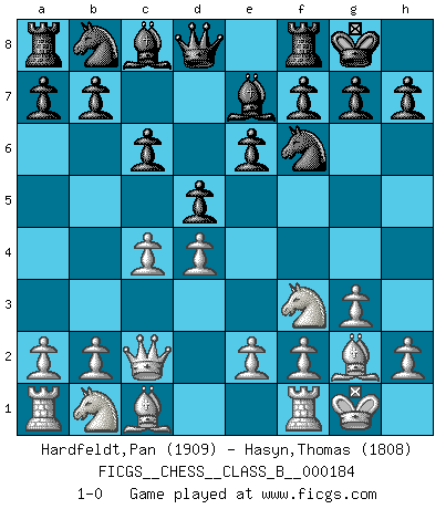 Last move : 1-0 2013 March 4 17:1:2 [Event "FICGS__CHESS__CLASS_B__000184"] [Site "FICGS"] [Date "2013.01.18"] [Round "1"] [White "Hardfeldt,Pan"] [Black "Hasyn,Thomas"] [Result "1-0"] [WhiteElo "1909"] [BlackElo "1808"] 1.d4 Nf6 2.c4 e6 3.g3 d5 4.Bg2 Be7 5.Nf3 O-O 6.Qc2 c6 7.O-O 1-0 This chess game has been lost on time (started : 2013.01.18 16:21:44) Catalan : Closed, 5.Nf3 Kingside Castling by player Black (move 5) Kingside Castling by player White (move 7) Player White won this chess game. Follow this game move after move (download)Chess opens and enriches your mind. (Saudin Robovic) Es gibt nur zwei wahre Schachgenies - das andere war Wilhelm Steinitz, der Weltmeister von 1872 bis 1894. (Robert James Fischer) El Ajedrez es el gimnasio de la mente. (Blaise Pascal) Des combinaisons [dans le jeu d'échecs] pareilles à des mélodies. Je crois entendre pour ainsi dire la musique des coups... (Vladimir Nabokov) The arrogant army will lose certainly the battle. (Chinese proverb)
