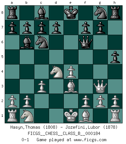 Last move : 0-1 2013 March 3 4:48:4 [Event "FICGS__CHESS__CLASS_B__000184"] [Site "FICGS"] [Date "2013.01.18"] [Round "1"] [White "Hasyn,Thomas"] [Black "Jozefini,Lubor"] [Result "0-1"] [WhiteElo "1808"] [BlackElo "1878"] 1.e4 e5 2.Nf3 Nc6 3.d4 exd4 4.Nxd4 Bb4+ 5.c3 Bc5 6.Be3 Bb6 7.Qg4 Qf6 8.Qg3 h5 0-1 This chess game has been lost on time (started : 2013.01.18 16:21:44) Scotch game Player Black won this chess game. Follow this game move after move (download)Chess makes man wiser and clear-sighted. (Vladimir Putin) Offensichtlich kennt Kasparow nichts anderes als Schach, und ich könnte 500 weitere Spieler dieser Sorte benennen. (Judith Polgar) El Ajedrez es una guerra en un tablero. El objetivo es aplastar la mente del oponente. (Bobby Fischer) Fischer est le meilleur joueur du monde et Karpov n'est qu'un joueur de bistrot. (Garry Kasparov, agé de 16 ans) This is where the fun begins. (Anakin Skywalker in Star Wars ep.3)