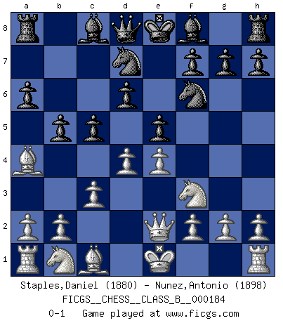Last move : 0-1 2013 March 19 6:24:58 [Event "FICGS__CHESS__CLASS_B__000184"] [Site "FICGS"] [Date "2013.01.18"] [Round "1"] [White "Staples,Daniel"] [Black "Nunez,Antonio"] [Result "0-1"] [WhiteElo "1880"] [BlackElo "1898"] 1.e4 c5 2.Nf3 d6 3.Bb5+ Nd7 4.c3 Ngf6 5.Qe2 a6 6.Ba4 e5 7.d4 b5 0-1 This chess game has been lost on time (started : 2013.01.18 16:21:44) Sicilian : Canal-Sokolsky (Nimzovich-Rossolimo, Moscow) attack Player Black won this chess game. Follow this game move after move (download)An attack on the wing should be met by play in the center. (Nimzovitch) Garry Kasparov war erst in der Großmeister-Organisation GMA, dann in der Profischach-Vereinigung PCA, zum Schluss kehrte er wieder in den Schoß der FIDE zurück. Aber gut, manche Leute sind flexibel (Viswanathan Anand) Muchos jugadores de Ajedrez se sorprendían cuando después de la partida, Fischer explicaba con calma: 'Yo ya había analizado esta posibilidad' en una posición en la cual yo creía que no era posible de prever desde la apertura. (Mikhail Tal) Les Echecs sont affaire de jugement sensible. Savoir quand frapper et quand esquiver. (Fischer) In theory there is no difference between theory and practice. In practice there is. (Yogi Berra)