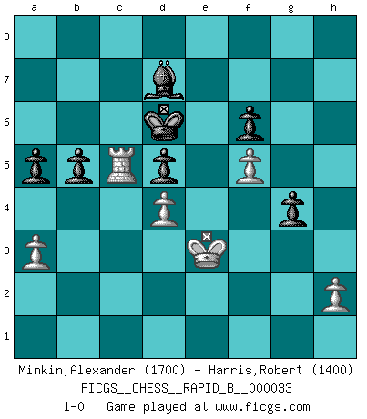 Last move : 1-0 2007 May 3 16:0:24 [Event "FICGS__CHESS__RAPID_B__000033"] [Site "FICGS"] [Date "2007.01.25"] [Round "1"] [White "Minkin,Alexander"] [Black "Harris,Robert"] [Result "1-0"] [WhiteElo "1700"] [BlackElo "1400"] 1.d4 d5 2.c4 e6 3.Nc3 Nf6 4.cxd5 exd5 5.Bg5 c6 6.e3 Be7 7.Bd3 O-O 8.Qc2 Nbd7 9.Nge2 Re8 10.O-O Nf8 11.f3 Ng6 12.Rad1 Nh5 13.Bxe7 Qxe7 14.e4 Qg5 15.exd5 cxd5 16.Qd2 Qxd2 17.Rxd2 Nf6 18.Bxg6 hxg6 19.Nf4 Rd8 20.g4 g5 21.Nh3 Nh7 22.Re1 Be6 23.Re5 Rac8 24.Kf2 Rc4 25.Nxg5 Nxg5 26.Rxg5 f6 27.Rh5 g6 28.Rh3 Kg7 29.Rg3 Rh8 30.Kg1 g5 31.R3g2 a6 32.Rge2 Kf7 33.Kg2 Rhc8 34.Kg3 b5 35.f4 Rxc3+ 36.bxc3 Rxc3+ 37.Kf2 Bxg4 38.Re3 Rxe3 39.Kxe3 Bf5 40.a3 Ke7 41.Rg2 g4 42.Re2 Kd6 43.Kd2 Kd7 44.Re3 Be6 45.Kc3 a5 46.Kd2 Kd6 47.Rc3 Bd7 48.Ke3 Be6 49.Rc5 Bd7 50.f5 1-0 QGD : Exchange, positional line, 5...c6 Kingside Castling by player Black (move 7) Kingside Castling by player White (move 10) Player White won this chess game. Follow this game move after move (download)When you don't know what to do, wait for your opponent to get an idea - it's sure to be wrong. (Tarrasch) Rauchen ist dem Schachspieler bei seiner Arbeit, also im Wettkampf, untersagt. (Viktor Kortschnoi) El Ajedrez lo es todo: arte, ciencia y deporte. (Anatoly Karpov) La victoire dans une partie d'Echecs appartient la plupart du temps à celui qui voit un peu plus loin que l'adversaire. (Lasker) Convictions are more dangerous enemies of truth than lies. (Friedrich Nietzsche)