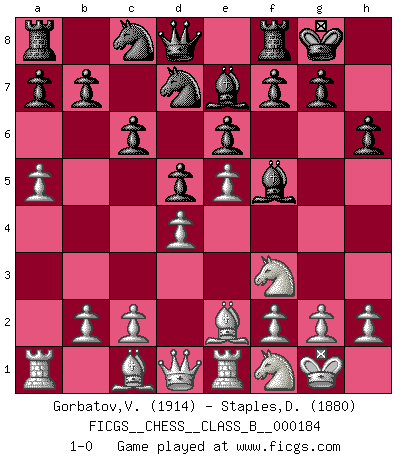 Last move : 1-0 2013 May 2 21:46:12 [Event "FICGS__CHESS__CLASS_B__000184"] [Site "FICGS"] [Date "2013.01.18"] [Round "1"] [White "Gorbatov,Valentin"] [Black "Staples,Daniel"] [Result "1-0"] [WhiteElo "1914"] [BlackElo "1880"] 1.e4 c6 2.d4 d5 3.e5 Bf5 4.Nf3 e6 5.Be2 Ne7 6.O-O h6 7.Nbd2 Nd7 8.a4 Nc8 9.a5 Be7 10.Re1 O-O 11.Nf1 1-0 This chess game has been lost on time (started : 2013.01.18 16:21:44) Caro-Kann : Advance variation Kingside Castling by player White (move 6) Kingside Castling by player Black (move 10) Player White won this chess game. Follow this game move after move (download)In Chess, at least, the brave inherit the earth. (Edmar Mednis) Ein Kibitz ist einer, der deinem Gegner gute Ratschläge gibt. (Andrew Soltis) Alekhine es un poeta que crea un trabajo de arte de algo que raramente inspiraría a otra persona a mandar una tarjeta postal. (Max Euwe) Ce qui caractérise les parties de combat, c'est que si le défenseur a constamment de difficiles problèmes à résoudre, l'attaquant doit chercher sans relâche de nouvelles possibilités d'attaque. (Koblentz) Nobody is always a winner, and anybody who says he is, is either a liar or doesn't play poker. (Amarillo Slim)