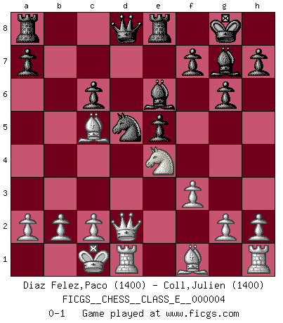 Last move : 0-1 2006 September 3 15:34:2 [Event "FICGS__CHESS__CLASS_E__000004"] [Site "FICGS"] [Date "2006.05.16"] [Round "1"] [White "Diaz Felez,Paco"] [Black "Coll,Julien"] [Result "0-1"] [WhiteElo "1400"] [BlackElo "1400"] 1.e4 c5 2.Nf3 d6 3.d4 cxd4 4.Nxd4 Nf6 5.Nc3 g6 6.Be3 Bg7 7.f3 O-O 8.Qd2 Nc6 9.O-O-O d5 10.exd5 Nxd5 11.Nxc6 bxc6 12.Bd4 e5 13.Bc5 Be6 14.Ne4 Re8 0-1 This chess game has been lost on time (started : 2006.05.16 12:49:50) Sicilian : Dragon, Yugoslav attack, 7...O-O Kingside Castling by player Black (move 7) Queenside Castling by player White (move 9) Player Black won this chess game. Follow this game move after move (download)The defensive power of a pinned piece is only imaginary. (Aaron Nimzovich) Garry Kasparov war erst in der Großmeister-Organisation GMA, dann in der Profischach-Vereinigung PCA, zum Schluss kehrte er wieder in den Schoß der FIDE zurück. Aber gut, manche Leute sind flexibel (Viswanathan Anand) Muchos jugadores de Ajedrez se sorprendían cuando después de la partida, Fischer explicaba con calma: 'Yo ya había analizado esta posibilidad' en una posición en la cual yo creía que no era posible de prever desde la apertura. (Mikhail Tal) Les Echecs ne sont pas pour les âmes timides. Ils requièrent un homme entier, qui ne s'arrête pas aveuglément à ce qui a été déjà établi, mais qui tente individuellement de sonder les profondeurs du jeu. (W. Steinitz) Every now and then a man's mind is stretched by a new idea and never shrinks back to its former dimensions. (Oliver Wendell Holmes, Sr.)