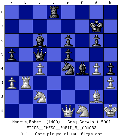 Last move : 0-1 2007 June 1 23:50:11 [Event "FICGS__CHESS__RAPID_B__000033"] [Site "FICGS"] [Date "2007.01.25"] [Round "1"] [White "Harris,Robert"] [Black "Gray,Garvin"] [Result "0-1"] [WhiteElo "1400"] [BlackElo "1500"] 1.c4 Nf6 2.Nc3 g6 3.g3 Bg7 4.Bg2 O-O 5.e4 d6 6.Nge2 c5 7.O-O Nc6 8.a3 Bd7 9.Rb1 Ne5 10.d3 a5 11.h3 Nc6 12.b3 Qc8 13.Kh2 Ne8 14.Nd5 Ra6 15.f4 e6 16.Ne3 Qc7 17.f5 Nf6 18.Bb2 Qb6 19.d4 cxd4 20.Nxd4 Ne5 21.fxg6 fxg6 22.Ndc2 Rf7 23.Qd2 Ra8 24.Rbd1 Qxb3 25.Bxe5 dxe5 26.Rb1 Qa4 27.Rxb7 Qc6 28.Rfb1 Qc5 29.R1b2 Bc6 30.Rxf7 Kxf7 31.Qe2 Rd8 32.Nf1 h5 33.Rb3 Bh6 34.Rb2 h4 35.g4 Kg7 36.Kh1 Rd6 37.Rb1 Bf4 38.Rb2 Nh7 39.Rb1 Ng5 40.Rb3 Rd8 41.Rb2 Nf7 42.Rb3 Nd6 43.Qe1 Nxe4 0-1 This chess game has been lost on time (started : 2007.01.25 15:59:11) English Opening Kingside Castling by player Black (move 4) Kingside Castling by player White (move 7) Player Black won this chess game. Follow this game move after move (download)My opponents make good moves too. Sometimes I don't take these things into consideration. (Bobby Fischer) Gewöhnliche Menschen denken nur daran, wie sie ihre Zeit verbringen. Ein intelligenter Mensch versucht, sie auszunutzen. (Arthur Schopenhauer) Todo lo que importa ante el tablero de Ajedrez son buenas jugadas. (Bobby Fischer) Le jeu d'échecs fait naître et fortifie en nous plusieurs qualités précieuses dans le cours de l'existence, telles que la prévoyance, la circonspection, la prudence, et la persévérance. (Benjamin Franklin - 1783, la morale des échecs) If everyone is thinking alike, then somebody isn't thinking. (US General George S. Patton)