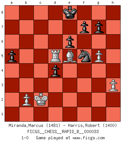 Last move : 1-0 2007 June 1 11:46:59 [Event "FICGS__CHESS__RAPID_B__000033"] [Site "FICGS"] [Date "2007.01.25"] [Round "1"] [White "Miranda,Marcus"] [Black "Harris,Robert"] [Result "1-0"] [WhiteElo "1481"] [BlackElo "1400"] 1.e4 c5 2.Nf3 Nc6 3.d4 cxd4 4.Nxd4 Qb6 5.Nb3 Nf6 6.Nc3 e6 7.Be3 Qc7 8.Qd2 a6 9.Bd3 Be7 10.O-O-O b5 11.a3 O-O 12.h3 Bb7 13.g4 d6 14.f4 Nd7 15.g5 b4 16.axb4 Nxb4 17.Be2 a5 18.Nb5 Qb8 19.Bf3 Rc8 20.Na3 Ba6 21.Kb1 Nxc2 22.Nxc2 Qxb3 23.Nd4 Qa4 24.Be2 Nc5 25.Bxa6 Rxa6 26.Qc2 Qxc2+ 27.Nxc2 Nxe4 28.Nd4 d5 29.Rc1 Rxc1+ 30.Rxc1 Ra8 31.Nf3 Bd6 32.Rc6 Kf8 33.Nd4 Ke7 34.Nb5 Kd7 35.Rb6 Rc8 36.Nxd6 Nxd6 37.Bd4 Nf5 38.Bc3 Ra8 39.Be5 h6 40.Rb7+ Ke8 41.Rc7 hxg5 42.fxg5 Rd8 43.Rc5 d4 44.Kc2 Rd5 45.Rxd5 1-0 This chess game has been lost on time (started : 2007.01.25 15:59:11) Sicilian defense Queenside Castling by player White (move 10) Kingside Castling by player Black (move 11) Player White won this chess game. Follow this game move after move (download)A passed Pawn increases in strength as the number of pieces on the board diminishes. (Capablanca) Jeder Schachmeister war einmal ein Anfänger. (Irving Chernev) Nunca nadie ha ganado una partida de Ajedrez rindiendose. (Unknown) L'action d'une oeuvre littéraire se déroule sur un champ de bataille. Les masques et les types du drame moderne correspondent aux pièces du jeu d'échecs. L'intrigue correspond aux coups et aux gambits, c'est à dire aux techniques du jeu telles qu'utilisées et interprétées par les joueurs. Les tactiques et les péripéties [mouvements] correspondent aux coups exécutés par l'adversaire. (Viktor Shklovsky) Creativity is inventing, experimenting, growing, taking risks, breaking rules, making mistakes, and having fun. (Mary Lou Cook)