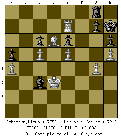 Last move : 1-0 2007 May 25 11:3:19 [Event "FICGS__CHESS__RAPID_B__000033"] [Site "FICGS"] [Date "2007.01.25"] [Round "1"] [White "Behrmann,Klaus"] [Black "Kepinski,Janusz"] [Result "1-0"] [WhiteElo "1775"] [BlackElo "1721"] 1.Nf3 c5 2.g3 Nc6 3.Bg2 Nf6 4.c4 d5 5.cxd5 Nxd5 6.d4 e6 7.O-O Be7 8.dxc5 Bxc5 9.e4 Nf6 10.Qxd8+ Nxd8 11.Nc3 O-O 12.e5 Nd5 13.Rd1 Nxc3 14.bxc3 Nc6 15.Rb1 h6 16.Rb5 Bb6 17.Ba3 Rd8 18.R5b1 Rxd1+ 19.Rxd1 Ba5 20.Rd3 f6 21.Bd6 Kf7 22.h3 Bb6 23.c4 Bd8 24.c5 Be7 25.Nd4 Bd7 26.Nxc6 Bxc6 27.Bxc6 bxc6 28.f4 fxe5 29.fxe5 a5 30.Rb3 Bg5 31.h4 Bd2 32.Rb7+ Kg6 33.Kg2 Rg8 34.g4 Be1 35.h5+ Kh7 36.Ra7 Bc3 37.Kf3 Rc8 38.Ke3 Bb4 39.a4 Bc3 40.Re7 Rg8 41.Kd3 1-0 This chess game has been lost on time (started : 2007.01.25 15:59:11) Reti Opening Kingside Castling by player White (move 7) Kingside Castling by player Black (move 11) Player White won this chess game. Follow this game move after move (download)When asked, -How is that you pick better moves than your opponents?, I responded: I'm very glad you asked me that, because, as it happens, there is a very simple answer. I think up my own moves, and I make my opponent think up his. (Alexander Alekhine) Der Umstand, daß uns eine 7 Stunden Zeitkontrolle ermöglicht eine großartige, tiefe Partie zu spielen, ist für die Massenmedien nicht weiter von Bedeutung. (Alexej Shirov) Un mal día en el Ajedrez, es mejor que cualquier buen día en el trabajo. (Anonymous) Le joueur d'Echecs qui veut atteindre le top est obligé de développer son propre credo créatif. Alexeï Stepanovicth Souétine. Il est facile d'écrire des livres ! Ce qui est difficile, c'est de jouer ! (Alexeï Stepanovicth Souétine) Just because you do not take an interest in politics doesn't mean politics won't take an interest in you. (Pericles 430 B.C.)