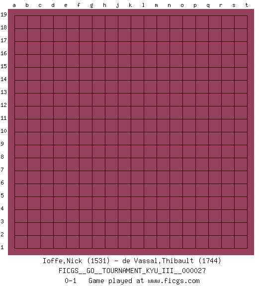 Last move : 0-1 2013 February 19 15:58:15 [Event "FICGS__GO__TOURNAMENT_KYU_III__000027"] [Site "FICGS"] [Date "2013.01.20"] [Round "1"] [Black "Ioffe,Nick"] [White "de Vassal,Thibault"] [Result "0-1"] [Rating 1 "1531"] [Rating 2 "1744"] 0-1 This go game has been lost on time (started : 2013.01.20 13:29:45) Here are the names of the openings (joseki) played in the four corners : Player White won this Go (weiqi, baduk) game. Follow this game move after move (download)Avoid the plate connection. (Anonymous) Luck is the residue of design. (John Milton)