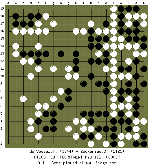 Last move : 0-1 2013 July 6 12:58:44 [Event "FICGS__GO__TOURNAMENT_KYU_III__000027"] [Site "FICGS"] [Date "2013.01.20"] [Round "1"] [Black "de Vassal,Thibault"] [White "Zeckarias,Simon"] [Result "0-1"] [Rating 1 "1744"] [Rating 2 "2121"] 1.q4 d16 2.q17 d4 3.r11 n16 4.r15 k16 5.o3 d10 6.g3 k10 7.m10 s4 8.r3 r7 9.s6 r6 10.s5 r5 11.r4 s3 12.s7 r2 13.r8 p7 14.q7 q6 15.q8 p5 16.p4 q2 17.q5 p6 18.p2 o4 19.p3 n4 20.m2 p8 21.c17 c16 22.d17 e17 23.e18 f18 24.f17 e16 25.d18 g17 26.b18 b16 27.b17 p10 28.m12 r10 29.s10 s9 30.r9 q10 31.t9 s11 32.s8 r12 33.m14 m3 34.l2 q1 35.s1 s2 36.t1 t4 37.t2 n2 38.n3 o1 39.m4 l3 40.k3 l4 41.m5 k4 42.o5 k2 43.p1 d3 44.q11 p12 45.s12 p11 46.t11 p15 47.k13 r14 48.s15 n13 49.k11 j11 50.k12 j10 51.n9 j3 52.n15 o16 53.o15 p16 54.p14 q14 55.o13 p13 56.o12 o14 57.n14 p14 58.m16 m17 59.o17 l16 60.m15 p17 61.q18 p18 62.h13 s18 63.q16 s14 64.t14 t13 65.t15 s13 66.s17 r18 67.r19 r17 68.s16 t17 69.s19 c7 70.g5 o11 71.n12 g7 72.h6 f6 73.j7 g11 74.f13 d12 75.e12 e11 76.d13 c12 77.c13 e14 78.e13 f16 79.l9 t18 80.q19 p19 81.r16 q15 82.l5 b13 83.n5 m1 84.o9 p9 85.o8 h8 86.j8 f4 87.g4 b14 88.f5 e5 89.f3 e2 90.e4 e6 0-1 Here are the names of the openings (joseki) played in the four corners : Corner d4 : d4 g3 Hoshi (Hwajeom, Seongjeom, Xingwei`) 4-4 Point. The star or hoshi (4-4) point, emphasizing influence at the potential expense of territory. Niken Kakari (Dukan Keolch'im, E`r Gua`jiao~, 2-Space Low Approach). White typically answers by 7-3 or 3-5 (which is not joseki). Corner d16 : d16 c17 Hoshi (Hwajeom, Seongjeom, Xingwei`) 4-4 Point. The star or hoshi (4-4) point, emphasizing influence at the potential expense of territory. Player White won this Go (weiqi, baduk) game. Follow this game move after move (download)The comb formation is alive. (Anonymous) Success without honor is an unseasoned dish; it will satisfy your hunger, but it won't taste good. (Joe Paterno)