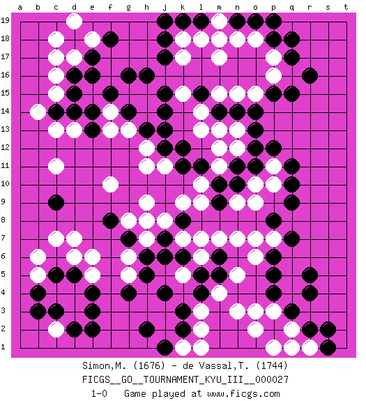 Last move : 1-0 2013 August 13 13:14:58 [Event "FICGS__GO__TOURNAMENT_KYU_III__000027"] [Site "FICGS"] [Date "2013.01.20"] [Round "1"] [Black "Simon,Mickael"] [White "de Vassal,Thibault"] [Result "1-0"] [Rating 1 "1676"] [Rating 2 "1744"] 1.r16 c16 2.q3 d3 3.e17 d17 4.e16 d13 5.j17 c7 6.g4 p17 7.q15 m17 8.r5 n3 9.k3 n5 10.p6 n7 11.q9 k5 12.j4 e5 13.h6 l3 14.l4 m4 15.l5 n9 16.n11 o10 17.q11 p7 18.q7 o6 19.p8 o7 20.q17 p16 21.p15 o15 22.o14 n15 23.n14 m15 24.j15 l14 25.j13 l2 26.k2 f10 27.c9 c11 28.c5 d7 29.e4 d4 30.d5 e6 31.b3 b6 32.e3 c2 33.e2 c4 34.b4 b5 35.d2 d6 36.c3 k18 37.j18 k17 38.k6 p3 39.p2 o2 40.p4 o3 41.p5 q2 42.r2 p1 43.r4 k1 44.j1 l1 45.h2 f14 46.d15 c15 47.d14 c13 48.f15 f13 49.d18 c18 50.d16 c17 51.o11 r1 52.s2 h14 53.j14 h15 54.h16 g6 55.h13 g13 56.g14 g15 57.g16 h7 58.j6 h12 59.j12 h11 60.g7 g8 61.f8 h9 62.p18 o18 63.q18 l6 64.m6 l7 65.m5 g5 66.h5 m7 67.j7 h8 68.k8 p10 69.q10 p11 70.p12 j11 71.k11 l9 72.c14 b14 73.s1 q1 74.o19 n18 75.n19 m19 76.p19 e18 77.f18 d19 78.l19 m18 79.k19 l18 80.j19 m13 81.g14 n13 82.o13 n12 83.n10 o9 84.o12 m11 85.m10 l10 86.m14 l13 87.l15 k15 88.l11 m12 89.m9 k9 90.k12 j8 91.e14 k7 92.e13 1-0 Here are the names of the openings (joseki) played in the four corners : Corner d16 : c16 e17 Komoku (Somok, Xiao~mu`) 3-4 Point. The komoku (3-4) point is the traditional corner enclosure move.. Ikken Kakari (Hankan Keolch'im, Yi Gua`jiao~, 1-Space Low Pincer). The small knight move is the basic approach move to the 3-4 point stone. It has been continually used for over four centuries. There are limitless variations, with new moves constantly being discovered. Black 2 opens the door to a treaure store of joseki. Corner q16 : r16 p17 Komoku (Somok, Xiao~mu`) 3-4 Point. The komoku (3-4) point is the traditional corner enclosure move.. Ikken Kakari (Hankan Keolch'im, Yi Gua`jiao~, 1-Space Low Pincer). The small knight move is the basic approach move to the 3-4 point stone. It has been continually used for over four centuries. There are limitless variations, with new moves constantly being discovered. White 2 opens the door to a treaure store of joseki. Player Black won this Go (weiqi, baduk) game. Follow this game move after move (download)Go is essentially a form of harmony. Go in the 21st century will have to be go of the 'harmony of the six points - the four quarters, the above and the below.' As in life we will need to view the whole rather than the part. Japanese go has focused too heavily on the local (joseki) rather than the whole for 300 years. The reason the Chinese and Koreans are overtaking the Japanese is that they are closer to achieve this whole-board view. (Go Seigen, 9p, 1994) Once you start thinking you have nothing left to learn, you have everything to learn. (Steve Badget)