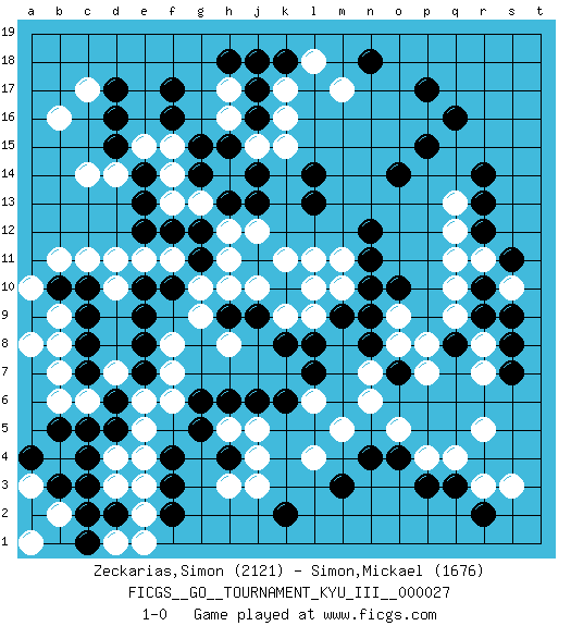 Last move : 1-0 2013 June 27 15:52:45 [Event "FICGS__GO__TOURNAMENT_KYU_III__000027"] [Site "FICGS"] [Date "2013.01.20"] [Round "1"] [Black "Zeckarias,Simon"] [White "Simon,Mickael"] [Result "1-0"] [Rating 1 "2121"] [Rating 2 "1676"] 1.q16 d4 2.q3 r5 3.d16 c14 4.f17 b16 5.r9 r3 6.r2 q4 7.p3 s3 8.m3 p4 9.o4 o5 10.n4 c17 11.j17 q10 12.r10 q11 13.r12 r11 14.s11 q12 15.r13 q13 16.r14 d10 17.f3 c6 18.p17 j3 19.c3 d3 20.d2 e2 21.c2 e3 22.b5 b6 23.c5 e6 24.f2 d1 25.d5 e5 26.f4 e4 27.c4 a3 28.a2 b2 29.c1 e1 30.b3 a1 31.a4 j5 32.d6 d7 33.c7 b7 34.c8 b8 35.c9 b9 36.c10 c11 37.b10 b11 38.e7 f7 39.e8 a10 40.o7 n6 41.o14 k16 42.j16 k15 43.n11 o9 44.n9 o8 45.n8 n7 46.o10 q9 47.j13 j15 48.h15 h14 49.j14 h16 50.g15 h17 51.k18 l18 52.h18 k17 53.j18 m17 54.h4 j4 55.g6 f6 56.h6 h5 57.g5 h3 58.j6 f8 59.k6 l4 60.k2 l6 61.l7 m5 62.e9 g9 63.f10 g10 64.l8 f11 65.e10 e11 66.g11 h11 67.g12 h12 68.h13 g13 69.f12 f13 70.e12 d11 71.e13 f14 72.e14 f15 73.f16 e15 74.d15 d14 75.g14 j10 76.j9 l11 77.h9 h10 78.l13 k9 79.k8 l9 80.m9 m11 81.n12 j12 82.l14 m10 83.k10 l10 84.n10 k11 85.n18 h8 86.q8 p7 87.s7 p8 88.p15 s10 89.s9 r8 90.s8 r7 91.a9 a8 92.d17 1-0 Here are the names of the openings (joseki) played in the four corners : Corner q4 : q3 r5 Komoku (Somok, Xiao~mu`) 3-4 Point. The komoku (3-4) point is the traditional corner enclosure move.. Ikken Kakari (Hankan Keolch'im, Yi Gua`jiao~, 1-Space Low Pincer). The small knight move is the basic approach move to the 3-4 point stone. It has been continually used for over four centuries. There are limitless variations, with new moves constantly being discovered. White 2 opens the door to a treaure store of joseki. Corner d16 : d16 c14 Hoshi (Hwajeom, Seongjeom, Xingwei`) 4-4 Point. The star or hoshi (4-4) point, emphasizing influence at the potential expense of territory. Ikken Kakari (Hankan Keolch'im, Yi Gua`jiao~, 1-Space Low Approach). White 2 is the standard approach move to the 4-4. Corner q16 : q16 q11 Hoshi (Hwajeom, Seongjeom, Xingwei`) 4-4 Point. The star or hoshi (4-4) point, emphasizing influence at the potential expense of territory. Corner d4 : d4 f3 Hoshi (Hwajeom, Seongjeom, Xingwei`) 4-4 Point. The star or hoshi (4-4) point, emphasizing influence at the potential expense of territory. Ikken Kakari (Hankan Keolch'im, Yi Gua`jiao~, 1-Space Low Approach). Black 2 is the standard approach move to the 4-4. Player Black won this Go (weiqi, baduk) game. Follow this game move after move (download)If there is no stone on the handicap point, the carpenter's square is dead. (Anonymous) Secret operations are essential in war; upon them the army relies to make its every move. (Sun Tzu)