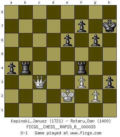 Last move : 0-1 2007 April 23 0:21:47 [Event "FICGS__CHESS__RAPID_B__000033"] [Site "FICGS"] [Date "2007.01.25"] [Round "1"] [White "Kepinski,Janusz"] [Black "Rotaru,Dan"] [Result "0-1"] [WhiteElo "1721"] [BlackElo "1400"] 1.d4 Nf6 2.c4 e6 3.a3 d5 4.e3 c5 5.Nf3 cxd4 6.exd4 Be7 7.Nc3 O-O 8.Bd3 dxc4 9.Bxc4 b6 10.O-O Bb7 11.Bg5 Nc6 12.Qd3 Nd5 13.Bd2 Nxc3 14.Bxc3 Na5 15.Ba2 Bd5 16.Bxa5 Bxa2 17.Rxa2 bxa5 18.R2a1 Rb8 19.Qe2 Qb6 20.Rab1 Rfd8 21.Rfd1 Bxa3 22.bxa3 Qxb1 23.Rxb1 Rxb1+ 24.Ne1 Rxd4 25.h3 R4d1 26.Qa6 Rxe1+ 27.Kh2 h6 28.Qxa5 Rh1+ 29.Kg3 Rb7 30.Qd8+ Kh7 31.Qd3+ g6 32.f3 Rc1 33.h4 Rc5 34.Qd6 Rd5 35.Qc6 Rbd7 36.a4 a5 37.Qb6 Rf5 38.Kh2 Rd3 39.Kg3 Rc3 40.Qd4 Rb3 41.Qd1 Rb4 42.Qc2 h5 43.Kf2 Rxh4 44.Ke3 Rb4 45.Kf2 h4 46.Ke3 R5f4 47.Qd2 Rxa4 48.Qc3 Rab4 49.Kd2 a4 50.Ke2 h3 0-1 This chess game has been lost on time (started : 2007.01.25 15:59:11) Queen's pawn game Kingside Castling by player Black (move 7) Kingside Castling by player White (move 10) Player Black won this chess game. Follow this game move after move (download)A Chess game is divided into three stages: the first, when you hope you have the advantage, the second when you believe you have an advantage, and the third... when you know you're going to lose ! (Savielly Tartakower) In der Schule lernt man nichts. Es ist nur Zeitverschwendung. (Robert James Fischer) Combinaciones deslumbrantes son para la mayoría, mover madera es para los pocos. (Georg Kieninger) Pour se monter efficace, un Cavalier a besoin d'avant-postes ! Les Cavaliers font les meilleurs bloqueurs de pions passés. History is a gallery of pictures in which there are few originals and many copies. (Alexis de Tocqueville)