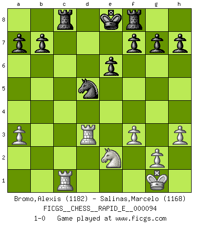 Last move : 1-0 2013 March 25 6:51:13 [Event "FICGS__CHESS__RAPID_E__000094"] [Site "FICGS"] [Date "2013.01.21"] [Round "1"] [White "Bromo,Alexis"] [Black "Salinas,Marcelo"] [Result "1-0"] [WhiteElo "1182"] [BlackElo "1168"] 1.d4 Nf6 2.c4 c6 3.Nc3 Qa5 4.Bd2 Qb4 5.e3 d5 6.b3 Bg4 7.Be2 Bxe2 8.Ngxe2 dxc4 9.bxc4 Qxc4 10.h3 Na6 11.O-O Qe6 12.Nf4 Qc4 13.Qf3 Nb4 14.Rfc1 Qa6 15.a3 Nd3 16.Nxd3 Qxd3 17.Rd1 Rc8 18.Ne2 e6 19.Bb4 Qe4 20.Qxe4 Nxe4 21.Bxf8 Rxf8 22.f3 Nd6 23.e4 Nc4 24.d5 cxd5 25.exd5 Ne3 26.Rd3 Nxd5 27.Rc1 1-0 This chess game has been lost on time (started : 2013.01.21 17:5:5) Queen's pawn game Kingside Castling by player White (move 11) Player White won this chess game. Follow this game move after move (download)Kasparov : J'adoube , Ivanchuk : S'il vous plaît ! (Garry Kasparov & Vassily Ivanchuk, Linares 1997) Ich würde die 30 stärksten Spieler der USA im Simultanspiel besiegen. (José Raúl Capablanca) Existen dos clases de sacrificios: los correctos y los mÃos. (Mikhail Tal) D'abord les bases : Jouez et étudiez, puis étudiez et jouez, ensuite jouez et étudiez, puis étudiez et jouez. Deuxièmement : Donnez toujours le meilleur de vous-même ! (Ken Smith) A computer lets you make more mistakes faster than any invention in human history - with the possible exceptions of handguns and tequila. (Mitch Ratcliffe)