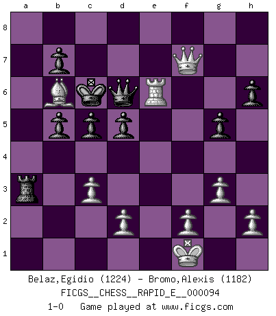 Last move : 1-0 2013 February 2 16:57:14 [Event "FICGS__CHESS__RAPID_E__000094"] [Site "FICGS"] [Date "2013.01.21"] [Round "1"] [White "Belaz,Egidio"] [Black "Bromo,Alexis"] [Result "1-0"] [WhiteElo "1224"] [BlackElo "1182"] 1.e4 e5 2.Nf3 Nc6 3.Bc4 h6 4.Nc3 Nf6 5.a3 a6 6.O-O Bc5 7.b4 Bb6 8.b5 axb5 9.Bd3 Bd4 10.Nxd4 Nxd4 11.Ne2 c6 12.Nxd4 exd4 13.e5 Nd5 14.Bb2 O-O 15.Bxd4 Nf4 16.Be4 Qg5 17.g3 d5 18.Bf3 Bh3 19.Be3 Bxf1 20.Bxf4 Qe7 21.Kxf1 Rxa3 22.Rb1 f6 23.exf6 Rxf6 24.c3 g5 25.Be3 Qd6 26.Be2 Kf7 27.Bh5+ Ke7 28.Bd4 Re6 29.Qf3 Kd8 30.Bb6+ Kd7 31.Bg4 c5 32.Bxe6+ Kxe6 33.Re1+ Kd7 34.Qf7+ Kc6 35.Re6 1-0 King's pawn game Kingside Castling by player White (move 6) Kingside Castling by player Black (move 14) Player White won this chess game. Follow this game move after move (download)The Pin is mightier than the sword. (Fred Reinfeld) Im Blitz ist es einfacher mit einer Figur weniger anzugreifen, als sich mit einer Mehrfigur zu verteidigen. (Mikhail Nekhemyevich Tal) Mi estilo es algo parecido entre un poco de Tal y Petrosian. (Reshevsky) Toute estimation doit être constamment réévaluée. (Jacob Estrin) He who fights with monsters should be careful lest he thereby become a monster. (Friedrich Nietzsche, Beyond Good and Evil)