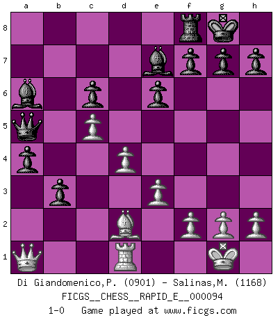 Last move : 1-0 2013 March 24 6:43:47 [Event "FICGS__CHESS__RAPID_E__000094"] [Site "FICGS"] [Date "2013.01.21"] [Round "1"] [White "Di Giandomenico,Pierino"] [Black "Salinas,Marcelo"] [Result "1-0"] [WhiteElo "0901"] [BlackElo "1168"] 1.d4 d5 2.c4 c6 3.c5 e6 4.Nf3 Nd7 5.e3 Ngf6 6.Ne5 Ne4 7.Bd3 Nxe5 8.O-O Nxd3 9.Qxd3 Be7 10.Nc3 O-O 11.b4 b5 12.a4 a5 13.Re1 axb4 14.Nxe4 dxe4 15.Qxe4 Rxa4 16.Rxa4 bxa4 17.Qb1 b3 18.Qa1 Qa5 19.Rd1 Ba6 20.Bd2 1-0 This chess game has been lost on time (started : 2013.01.21 17:5:5) QGD Slav defense Kingside Castling by player White (move 8) Kingside Castling by player Black (move 10) Player White won this chess game. Follow this game move after move (download)A passed Pawn increases in strength as the number of pieces on the board diminishes. (Capablanca) Jeder Schachmeister war einmal ein Anfänger. (Irving Chernev) La señal de un Gran Maestro es su habilidad de ganar una partida rápidamente y sin dolor. (Irving Chernev) La menace est plus forte que l'exécution. (Aaron Nimzovitch) The mind is like a parachute, it only functions when its open. (Unknown)