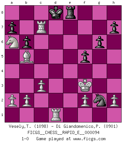 Last move : 1-0 2013 February 20 12:44:1 [Event "FICGS__CHESS__RAPID_E__000094"] [Site "FICGS"] [Date "2013.01.21"] [Round "1"] [White "Vesely,Tomas"] [Black "Di Giandomenico,Pierino"] [Result "1-0"] [WhiteElo "1098"] [BlackElo "0901"] 1.e4 e5 2.d4 d5 3.dxe5 dxe4 4.Qxd8+ Kxd8 5.Nc3 Be6 6.Nge2 Nc6 7.Nxe4 Bb4+ 8.c3 Be7 9.Bg5 Nxe5 10.Nd4 Bd5 11.Bxe7+ Nxe7 12.Nc5 Nd3+ 13.Bxd3 b6 14.Na6 c5 15.Nf5 g6 16.Nd6 Kd7 17.Ne4 c4 18.Nf6+ Kd8 19.Nxd5 Nxd5 20.Bxc4 Nf4 21.Rd1+ Kc8 22.Bb5 Nxg2+ 23.Ke2 Re8+ 24.Bxe8 Kb7 25.Bb5 Re8+ 26.Kf3 f5 27.Rd7+ Kc8 28.Rc7+ Kd8 29.Rd1+ 1-0 King's pawn game Player White won this chess game. Follow this game move after move (download)The chessboard is the world, the pieces are the phenomena of the Universe, the rules of the game are what we call the laws of Nature and the player on the other side is hidden from us. (Thomas Huxley) Ich kenne keine einzige Person, die behaupten würde, Garri Kasparow sei ein guter Mensch (Nigel Short) Los errores estan ahí, esperando a que se cometan. (Savielly Tartakower) Le joueur d'Echecs qui veut atteindre le top est obligé de développer son propre credo créatif. Alexeï Stepanovicth Souétine. Il est facile d'écrire des livres ! Ce qui est difficile, c'est de jouer ! (Alexeï Stepanovicth Souétine) In fact if nothing is done against this teddy bear, hereby I announce that I would quit chess, rapid chess, blitz chess, postal chess, email chess, server chess and correspondence chess I will then switch to a table game where teddy bears aren't going to be seen for a while, like Poker, or Roulette, all 18+ games. (Elmer Valderrama)