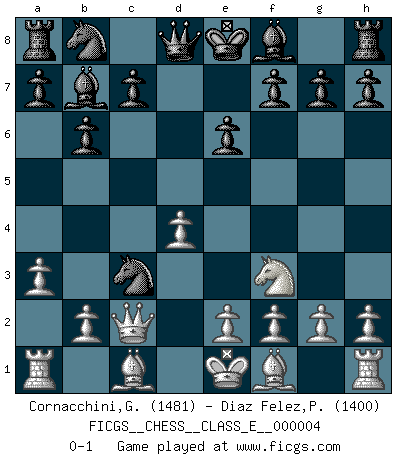 Last move : 0-1 2006 August 3 15:27:12 [Event "FICGS__CHESS__CLASS_E__000004"] [Site "FICGS"] [Date "2006.05.16"] [Round "1"] [White "Cornacchini,Gabriele"] [Black "Diaz Felez,Paco"] [Result "0-1"] [WhiteElo "1481"] [BlackElo "1400"] 1.d4 Nf6 2.c4 e6 3.Nf3 b6 4.a3 Bb7 5.Nc3 d5 6.cxd5 Nxd5 7.Qc2 Nxc3 0-1 This chess game has been lost on time (started : 2006.05.16 12:49:50) Queen's Indian : Petrosian system Player Black won this chess game. Follow this game move after move (download)The way he plays Chess demonstrates a man's whole nature. (Stanley Ellin) Im Schach gewinnt jeder. Hat man Freunde am Spiel - und das ist die Hauptsache - ist auch der Verlust einer Partie kein Unglück. (David Bronstein) El jugador de combinación piensa hacia adelante; comienza de la posición dada y trabaja las movidas contundentes en su mente. (Emanuel Lasker) Le succès, c'est être capable d'aller d'échec en échec sans perdre son enthousiasme. (Winston Churchill) Good decisions come from experience, and experience comes from bad decisions. (Anonymous)