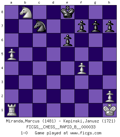 Last move : 1-0 2007 March 24 20:50:54 [Event "FICGS__CHESS__RAPID_B__000033"] [Site "FICGS"] [Date "2007.01.25"] [Round "1"] [White "Miranda,Marcus"] [Black "Kepinski,Janusz"] [Result "1-0"] [WhiteElo "1481"] [BlackElo "1721"] 1.e4 e6 2.d4 d5 3.Nd2 Nf6 4.e5 Ne4 5.Nxe4 dxe4 6.Be3 b6 7.Ne2 Bb7 8.Ng3 c5 9.dxc5 Qxd1+ 10.Rxd1 Bxc5 11.Bxc5 bxc5 12.Bb5+ Bc6 13.Bxc6+ Nxc6 14.Nxe4 Rb8 15.b3 Nxe5 16.Nxc5 Rc8 17.b4 a5 18.c3 axb4 19.cxb4 O-O 20.O-O Rfd8 21.Rxd8+ Rxd8 22.a4 Rd2 23.f4 Nc4 24.Ra1 Ne3 25.b5 Rxg2+ 26.Kh1 Rb2 27.a5 Nd5 28.b6 Kf8 29.b7 Nc7 30.b8Q+ Rxb8 31.Nd7+ Ke8 32.Nxb8 1-0 French : Tarrasch, Closed variation Kingside Castling by player Black (move 19) Kingside Castling by player White (move 20) Promotion Queen by player White (move 30) Player White won this chess game. Follow this game move after move (download)There is only one thing Fischer does in Chess without pleasure: to lose ! (Boris Spassky) Der Partner hat auch seine Existenzberechtigung. (Savielly Grigorievitsch Tartakower) Las Aperturas te enseñan aperturas. ¡Los Finales te enseñan Ajedrez!. (Stephan Gerzadowicz) Votre seul travail dans les ouvertures est d'obtenir un milieu de partie jouable. (Lajos Portish) A good aphorism is too hard for the tooth of time, and is not worn away with the centuries, although it serves as food for every speech. (Friedrich Nietzsche)