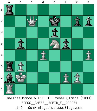 Last move : 1-0 2013 March 14 0:59:32 [Event "FICGS__CHESS__RAPID_E__000094"] [Site "FICGS"] [Date "2013.01.21"] [Round "1"] [White "Salinas,Marcelo"] [Black "Vesely,Tomas"] [Result "1-0"] [WhiteElo "1168"] [BlackElo "1098"] 1.Nf3 b6 2.e4 Bb7 3.d4 e6 4.Bg5 Be7 5.Qd2 Bxe4 6.Bxe7 Qxe7 7.Ne5 Nc6 8.Bb5 Nf6 9.Nc3 O-O 10.Bxc6 dxc6 11.Qg5 Bd5 12.h4 Qb4 13.Nd3 Ne4 14.Qe3 Nxc3 15.Nxb4 Ne4 16.O-O-O a5 17.Nd3 f5 18.Ne5 Bxa2 19.b3 a4 20.Kb2 axb3 21.cxb3 Ra6 22.Ra1 Rfa8 23.Nxc6 Ra3 24.Rhc1 Kf7 25.Rc3 Nxc3 26.Qxc3 b5 27.Ne5+ Ke7 28.Qxc7+ 1-0 Reti Opening Kingside Castling by player Black (move 9) Queenside Castling by player White (move 16) Player White won this chess game. Follow this game move after move (download)Chess is mental torture. (Garry Kasparov) Ich verstehe Aljechins Kombinationen ganz gut; aber woher er diese Angriffschancen bekommt und wie er die Eröffnung behandelt das ist für mich ein Buch mit sieben Siegeln. (Rudolf Spielmann) Evita las multitudes. Haz independientemente tu propio razonamiento. Trata de ser el jugador de Ajedrez, no la pieza de Ajedrez. (Ralph Charell) Demandez au pauvre Cg1 ce qu'il en pense. Eduard Gufeld à propos de la variante Saemisch de l'Est-Indienne. I couldn't make any sense out of what this particular thread is about. It sounds like R2 D2 computer speaking. A space fight ?!? Some 'command' problems in Moscow ? Some killers & narcotic addicts attacking some game & a god wannabe ?? (Dinesh De Silva, lost in a russian conflict in FICGS forum)