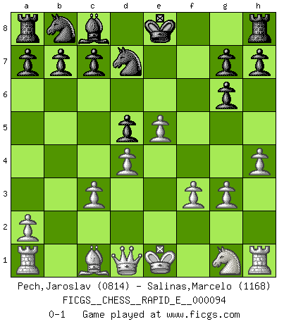 Last move : 0-1 2013 May 18 10:51:37 [Event "FICGS__CHESS__RAPID_E__000094"] [Site "FICGS"] [Date "2013.01.21"] [Round "1"] [White "Pech,Jaroslav"] [Black "Salinas,Marcelo"] [Result "0-1"] [WhiteElo "0814"] [BlackElo "1168"] 1.d4 e6 2.c4 Bb4+ 3.Nc3 Bxc3+ 4.bxc3 d6 5.e4 Nf6 6.f3 d5 7.e5 Nfd7 8.cxd5 exd5 9.Bd3 Qh4+ 10.g3 Qh5 11.h4 Qg6 12.Bxg6 fxg6 0-1 This chess game has been lost on time (started : 2013.01.21 17:5:5) Queen's pawn : Franco-Indian (Keres) defense Player Black won this chess game. Follow this game move after move (download)First-class players lose to second class players because second-class players sometimes play a first-class game. (Tarrasch) Es ist nicht das erste mal, dass sich die FIDE dem Arabischen Geld gebeugt hat (über die FIDE WM 2004 in Lybien). (Larry Evans) No es tiempo de jugar al Ajedrez cuando la casa esta en llamas. (Proverbio Italiano) Nous vivons dans un monde échiquéen : chaque jour qui passe est un défi à relever. (Philosophe Sasha) Art is not a thing, it is a way. (Elbert Hubbard)