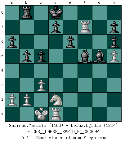 Last move : 0-1 2013 April 10 8:45:46 [Event "FICGS__CHESS__RAPID_E__000094"] [Site "FICGS"] [Date "2013.01.21"] [Round "1"] [White "Salinas,Marcelo"] [Black "Belaz,Egidio"] [Result "0-1"] [WhiteElo "1168"] [BlackElo "1224"] 1.e4 c5 2.Bc4 Nc6 3.Qf3 Ne5 4.Qb3 Nxc4 5.Qxc4 e6 6.e5 Nh6 7.d3 a6 8.Be3 b5 9.Qe4 Rb8 10.Nh3 Bb7 11.Qf4 Bxg2 12.f3 Bxh3 13.Qg3 Bf5 14.Bxh6 gxh6 15.Nd2 Qa5 16.c3 Bxd3 17.Nb3 Qc7 18.f4 Rg8 19.Qxg8 Bg6 20.Qh8 Qc6 21.O-O-O Qe4 22.Nd2 Qxf4 23.Qf6 Qxf6 24.exf6 Bd6 25.h4 Be5 26.h5 Bf5 27.Rhg1 Kd8 28.Rg7 Bxf6 29.Rxf7 Bg5 0-1 This chess game has been lost on time (started : 2013.01.21 17:5:5) Sicilian defense Queenside Castling by player White (move 21) Player Black won this chess game. Follow this game move after move (download)Fischer Chess play was always razor-sharp, rational and brilliant. One of the best ever. (Dave Regis) Offener Brief an US-Präsident Bush anlässlich der Verhaftung Bobby Fishers: Verhaften Sie mich. Stecken Sie mich in dieselbe Zelle wie Bobby Fisher und geben Sie uns ein Schachspiel mit. (Boris Vassilievich Spassky) Estaba muy claro de que el punto vulnerable del Gran Maestro Americano (Bobby Fischer) radicaba en las posiciones de doble filo, colgantes, irracionales, donde el siempre falló en encontrar un triunfo aún en una posición de clara victoria. (Efim Geller) Les échecs sont utiles à l'exercice de la faculté de penser et à celle de l'imagination. Car nous devons posséder une méthode élaborée pour atteindre des buts partout où nous devons conduire notre raison. (Leibnitz) It's not enough to succeed. Others must fail. (Gore Vidal)