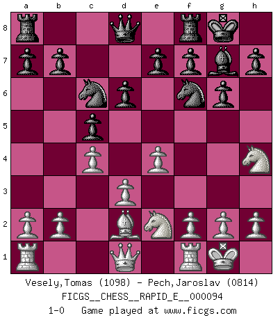 Last move : 1-0 2013 May 22 23:12:44 [Event "FICGS__CHESS__RAPID_E__000094"] [Site "FICGS"] [Date "2013.01.21"] [Round "1"] [White "Vesely,Tomas"] [Black "Pech,Jaroslav"] [Result "1-0"] [WhiteElo "1098"] [BlackElo "0814"] 1.e4 c5 2.c4 Nc6 3.Nc3 g6 4.d3 Bg7 5.Bd2 Nf6 6.Nf3 d6 7.Be2 O-O 8.O-O Bg4 9.Nh4 Bxe2 10.Nxe2 1-0 This chess game has been lost on time (started : 2013.01.21 17:5:5) Sicilian defense Kingside Castling by player Black (move 7) Kingside Castling by player White (move 8) Player White won this chess game. Follow this game move after move (download)Good offense and good defense both begin with good development. (Bruce A. Moon) Du weisst es gibt ein Problem mit Computern und Fernschach, wenn jeder eine Rating von 2450 hat. (John Christen Knudsen) Bobby solo arroja las piezas y solas caen en las casillas correctas. (Miguel Najdorf ) Les réformistes prétendent que les progrès de la théorie conduiront à la disparition des échecs, et qu'il faut, pour leur rendre vie, en remanier les règles. En réalité, qu'exprime cette affirmation? Le mépris de l'intuition, de l'imagination et de tous les autres éléments qui font des échecs un art. (Alexander Alekhine) Train yourself to let go of everything you fear to lose. (Master Yoda in Star Wars ep.3)