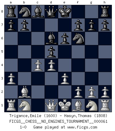 Last move : 1-0 2013 March 8 17:17:27 [Event "FICGS__CHESS__NO_ENGINES_TOURNAMENT__000061"] [Site "FICGS"] [Date "2013.01.21"] [Round "1"] [White "Trigance,Emile"] [Black "Hasyn,Thomas"] [Result "1-0"] [WhiteElo "1600"] [BlackElo "1808"] 1.b4 Nf6 2.Bb2 d5 3.e3 e6 4.a3 c5 5.bxc5 Bxc5 6.d4 Bd6 7.c4 1-0 This chess game has been lost on time (started : 2013.01.21 17:25:15) Polish (Sokolsky) opening Player White won this chess game. Follow this game move after move (download)Different people feel differently about resigning. (Bobby Fischer) Um sich vor der Gefahr einer Erkältung zu schützen, sorge der wanderlustige König beizeiten für ein brauchbares Versteck. (Aaron Nimzowitsch) ¿Cual es el objetivo de jugar una apertura de gambito?... Para adquirir una reputación de ser un jugador apuesto a costo de perder el juego. (Siegbert Tarrasch) L'ordinateur a tué l'originalité. Il n'y a plus guère d'aventures sur l'échiquier. (Jacob Murray) Opportunities multiply as they are seized. (Sun Tzu)
