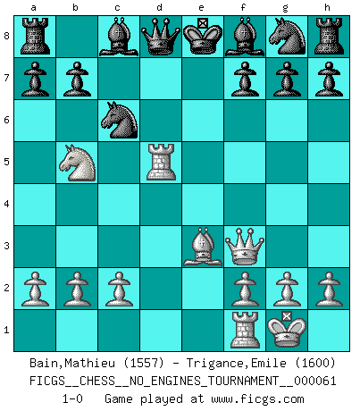 Last move : 1-0 2013 April 4 11:16:39 [Event "FICGS__CHESS__NO_ENGINES_TOURNAMENT__000061"] [Site "FICGS"] [Date "2013.01.21"] [Round "1"] [White "Bain,Mathieu"] [Black "Trigance,Emile"] [Result "1-0"] [WhiteElo "1557"] [BlackElo "1600"] 1.e4 c5 2.Nf3 Nc6 3.d4 cxd4 4.Nxd4 Nf6 5.Bd3 Nxd4 6.e5 Ng8 7.Be3 Qa5+ 8.Nc3 Qxe5 9.O-O Nc6 10.Bc4 e6 11.Qf3 Qc7 12.Nb5 Qd8 13.Rad1 d5 14.Bxd5 exd5 15.Rxd5 1-0 Sicilian defense Kingside Castling by player White (move 9) Player White won this chess game. Follow this game move after move (download)Chess is a terrific way for kids to build self image and self esteem. (Saudin Robovic) Der vorletzte Fehler gewinnt. (Savielly Grigorievitsch Tartakower) Sin errores no puede haber brillantez. (Emanuel Lasker) Ce qui est bien, c'est d'avoir tout un tas de pièces en prise : l'adversaire ne peut en prendre qu'une à la fois. Cité par Thierry Audin. Mandala - that's it! 16x16 squares as multiple of the four and the eight because of the Four Noble Truths and the Noble Eightfold Path. (Heinz-Georg Lehnhoff about Big Chess)
