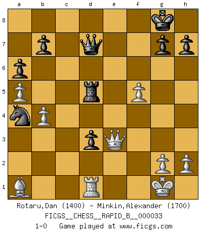 Last move : 1-0 2007 February 19 7:41:29 [Event "FICGS__CHESS__RAPID_B__000033"] [Site "FICGS"] [Date "2007.01.25"] [Round "1"] [White "Rotaru,Dan"] [Black "Minkin,Alexander"] [Result "1-0"] [WhiteElo "1400"] [BlackElo "1700"] 1.e4 c5 2.Nf3 d6 3.Bb5+ Bd7 4.a4 Nf6 5.Nc3 e5 6.Bxd7+ Nfxd7 7.O-O Be7 8.d3 Nc6 9.Nd5 O-O 10.c3 Nf6 11.a5 Qd7 12.Qa4 Nxd5 13.exd5 Nb8 14.Qb3 Na6 15.Bd2 f5 16.Nxe5 dxe5 17.d6 Rf7 18.dxe7 Qxe7 19.Rfe1 Qd6 20.Rad1 f4 21.d4 cxd4 22.cxd4 exd4 23.Bc3 d3 24.Qc4 Rd8 25.Re4 Qd5 26.Re8+ Rf8 27.Rxf8+ Kxf8 28.Qxf4+ Kg8 29.Re1 Qf7 30.Qg5 Rd7 31.Qe3 Rd8 32.Rd1 Qd5 33.Qe7 Qd7 34.Qe5 Qf7 35.Qg5 Rd5 36.Qe3 Nc5 37.b4 Na4 38.Ba1 a6 39.f4 Qd7 40.f5 1-0 Sicilian : Canal-Sokolsky attack, 3...Bd7 Kingside Castling by player White (move 7) Kingside Castling by player Black (move 9) Player White won this chess game. Follow this game move after move (download)He who fears an isolated Queen's Pawn should give up Chess. (Siegbert Tarrasch) Ich habe die Schachforschung dermaßen betrieben, dass sie auf eine wissenschaftliche Basis gestellt wurde. (Mikhail Moiseyevich Botvinik) El Ajedrez no es una pizca de inferior al violín, y tenemos un gran número de violinistas profesionales. (Mikhail Botvinnik) Des idées, des idées, j'en ai cent, j'en ai mille. Des bonnes, des mauvaises, applicables, irréalisables... Il suffit de faire le tri ! (Roos) For to win one hundred victories in one hundred battles is not the acme of skill. To subdue the enemy without fighting is the acme of skill. (Sun Tzu)