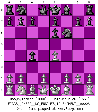 Last move : 0-1 2013 March 15 5:44:2 [Event "FICGS__CHESS__NO_ENGINES_TOURNAMENT__000061"] [Site "FICGS"] [Date "2013.01.21"] [Round "1"] [White "Hasyn,Thomas"] [Black "Bain,Mathieu"] [Result "0-1"] [WhiteElo "1808"] [BlackElo "1557"] 1.Nf3 d5 2.c4 dxc4 3.e4 Be6 4.Ng5 Nf6 5.Nxe6 fxe6 0-1 This chess game has been lost on time (started : 2013.01.21 17:25:15) Reti accepted Player Black won this chess game. Follow this game move after move (download)The boy (then a 12 year old boy named Anatoly Karpov) doesn't have a clue about Chess, and there's no future at all for him in this profession. (Mikhail Botvinnik) Wenn ein Kopf und ein Buch zusammenstoßen und es klingt hohl, ist es denn allemal im Buche? (Georg Christoph Lichtenberg) Prefiero perder una partida realmente buena, que ganar una mala. (David Levy) Vous savez, camarade Pachman, je n'éprouve pas de plaisir à être ministre, je jouerais plutôt aux échecs comme vous, ou alors ferais une révolution au Venezuela. (Che Guevara à Ludek Pachman, 'Checkmate in Prague', 1975) That's absurd. I love it. (Gregory House, House M.D.)