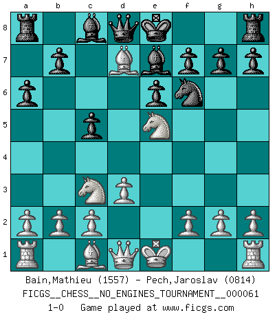 Last move : 1-0 2013 May 8 22:9:12 [Event "FICGS__CHESS__NO_ENGINES_TOURNAMENT__000061"] [Site "FICGS"] [Date "2013.01.21"] [Round "1"] [White "Bain,Mathieu"] [Black "Pech,Jaroslav"] [Result "1-0"] [WhiteElo "1557"] [BlackElo "0814"] 1.e4 c5 2.Nf3 d6 3.Bc4 e6 4.Nc3 Nf6 5.e5 dxe5 6.Nxe5 Nbd7 7.Bb5 Be7 8.d3 a6 9.Bxd7+ 1-0 This chess game has been lost on time (started : 2013.01.21 17:25:15) Sicilian Player White won this chess game. Follow this game move after move (download)There must have been a time when men were demigods, or they could not have invented Chess. (Gustav Schenk) Spiel ein langweiliges Spiel zu Ende und lustige Dinge können passieren. (Hans Ree) Una mala movida nulifica cuarenta buenas. (Horowitz) Vous m'avez demandé de vous exposer quel est le fondement de la prière. Je ne fais que préparer les pièces du jeu sur la table... Nous sera-t-il permis d'en adopter les règles et si nous les appliquons scrupuleusement nous ne tarderons pas à faire mat le Roi divin ! Il ne pourra échapper à nos mains. (Sainte Thérèse d'Avila, Chemin de perfection) 98% of all statistics are made up. (Author unknown)