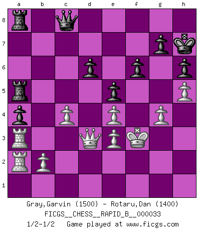 Last move : 1/2-1/2 2007 February 24 18:48:3 [Event "FICGS__CHESS__RAPID_B__000033"] [Site "FICGS"] [Date "2007.01.25"] [Round "1"] [White "Gray,Garvin"] [Black "Rotaru,Dan"] [Result "1/2-1/2"] [WhiteElo "1500"] [BlackElo "1400"] 1.e4 c5 2.Nf3 Nc6 3.d4 cxd4 4.Nxd4 Nf6 5.Nc3 e6 6.Ndb5 d6 7.Bf4 e5 8.Bg5 a6 9.Na3 b5 10.Nd5 Be7 11.Bxf6 Bxf6 12.c3 Bg5 13.Nc2 O-O 14.h4 Bh6 15.g4 f6 16.a4 bxa4 17.Rxa4 Ne7 18.Nce3 Kh8 19.Bc4 Nxd5 20.Bxd5 Ra7 21.Qf3 a5 22.O-O Qd7 23.Rfa1 Bxe3 24.fxe3 Qc7 25.Kg2 Bd7 26.R4a3 a4 27.Kg3 Bc6 28.Qd1 Bxd5 29.Qxd5 Qb6 30.Qd2 Rfa8 31.c4 h6 32.h5 Kh7 33.Kf3 Qb7 34.R1a2 Qc7 35.Qd5 Ra5 36.Qe6 Qc6 37.Rd3 R5a6 38.Qd5 Qc8 39.Rda3 Ra5 40.Qd3 1/2-1/2 Sicilian defense Kingside Castling by player Black (move 13) Kingside Castling by player White (move 22) This chess game ended in a draw. Follow this game move after move (download)If a ruler does not understand Chess, how can he rule over a kingdom ? (King Khusros II) Wie kann ich Remis annehmen? Ich weiß ja gar nicht, wie ich stehe! (Fritz Sämisch) Haz el enroque temprano y seguido. (Rob Sillars) Ce qui est bien, c'est d'avoir tout un tas de pièces en prise : l'adversaire ne peut en prendre qu'une à la fois. Cité par Thierry Audin. If you have any trouble condescending, find a Unix user to show you how it's done. (Scott Adams)