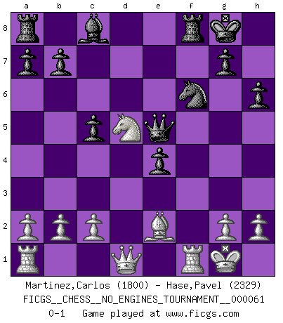 Last move : 0-1 2013 May 20 11:3:3 [Event "FICGS__CHESS__NO_ENGINES_TOURNAMENT__000061"] [Site "FICGS"] [Date "2013.01.21"] [Round "1"] [White "Martinez,Carlos"] [Black "Hase,Pavel"] [Result "0-1"] [WhiteElo "1800"] [BlackElo "2329"] 1.d4 Nf6 2.Nf3 e6 3.Bg5 d5 4.Ne5 c5 5.e3 Be7 6.Nc3 O-O 7.Be2 Nbd7 8.f4 h6 9.Bh4 Ne4 10.Bxe7 Qxe7 11.O-O Nxe5 12.fxe5 f5 13.exf6 Nxf6 14.e4 dxe4 15.d5 exd5 16.Nxd5 Qe5 0-1 This chess game has been lost on time (started : 2013.01.21 17:25:15) Queen's pawn : Torre attack Kingside Castling by player Black (move 6) Kingside Castling by player White (move 11) Player Black won this chess game. Follow this game move after move (download)Play the opening like a book, the middle game like a magician, and the endgame like a machine. (Spielmann) Karpov ist ein Museumsstück. (Garry Kasparov) Peones: ellos son el alma de esta partida, solos forman el ataque y la defensa. (Philidor) Les ravages du H expliquent la différence de niveau entre Tal et Thal [Abergel]. The problem with manipulation is that people can turn on you. (Horatio Caine, C.S.I. Miami)