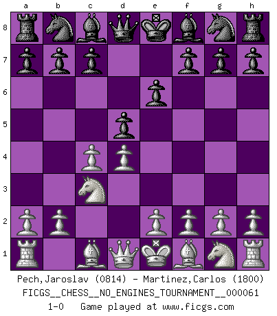 Last move : 1-0 2013 May 4 21:51:25 [Event "FICGS__CHESS__NO_ENGINES_TOURNAMENT__000061"] [Site "FICGS"] [Date "2013.01.21"] [Round "1"] [White "Pech,Jaroslav"] [Black "Martinez,Carlos"] [Result "1-0"] [WhiteElo "0814"] [BlackElo "1800"] 1.d4 d5 2.c4 e6 3.Nc3 1-0 This chess game has been lost on time (started : 2013.01.21 17:25:15) QGD : 3.Nc3 Player White won this chess game. Follow this game move after move (download)If your opponent cannot do anything active, then don't rush the position; instead you should let him sit there, suffer, and beg you for a draw. (Jeremy Silman) Ich bin der einzige Schachspieler, der sich während der Vorbereitungen zum Turnier verletzt hat. (Woody Allen) No hay un Gran Maestro de Ajedrez que sea normal; solo se diferencían ellos por la magnitud de su locura. (Viktor Korchnoi) Pour se monter efficace, un Cavalier a besoin d'avant-postes ! Les Cavaliers font les meilleurs bloqueurs de pions passés. The next best thing to gambling and winning is gambling and loosing. (Nick Dandalos)